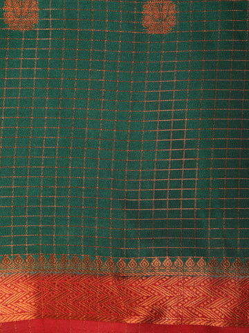 Bottle Green Checks Woven Design Banarasi Silk Saree With Contrast Red Border