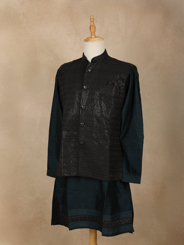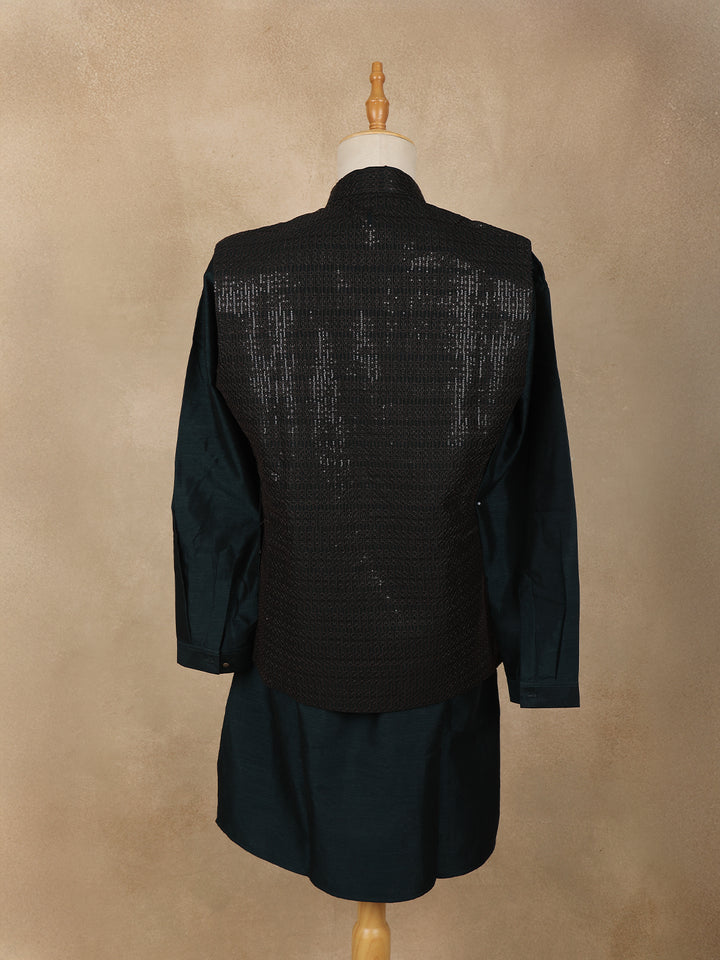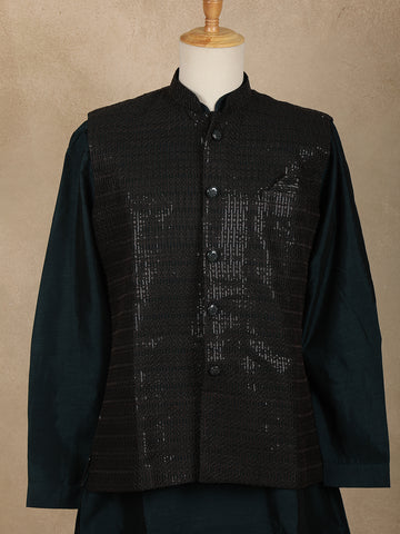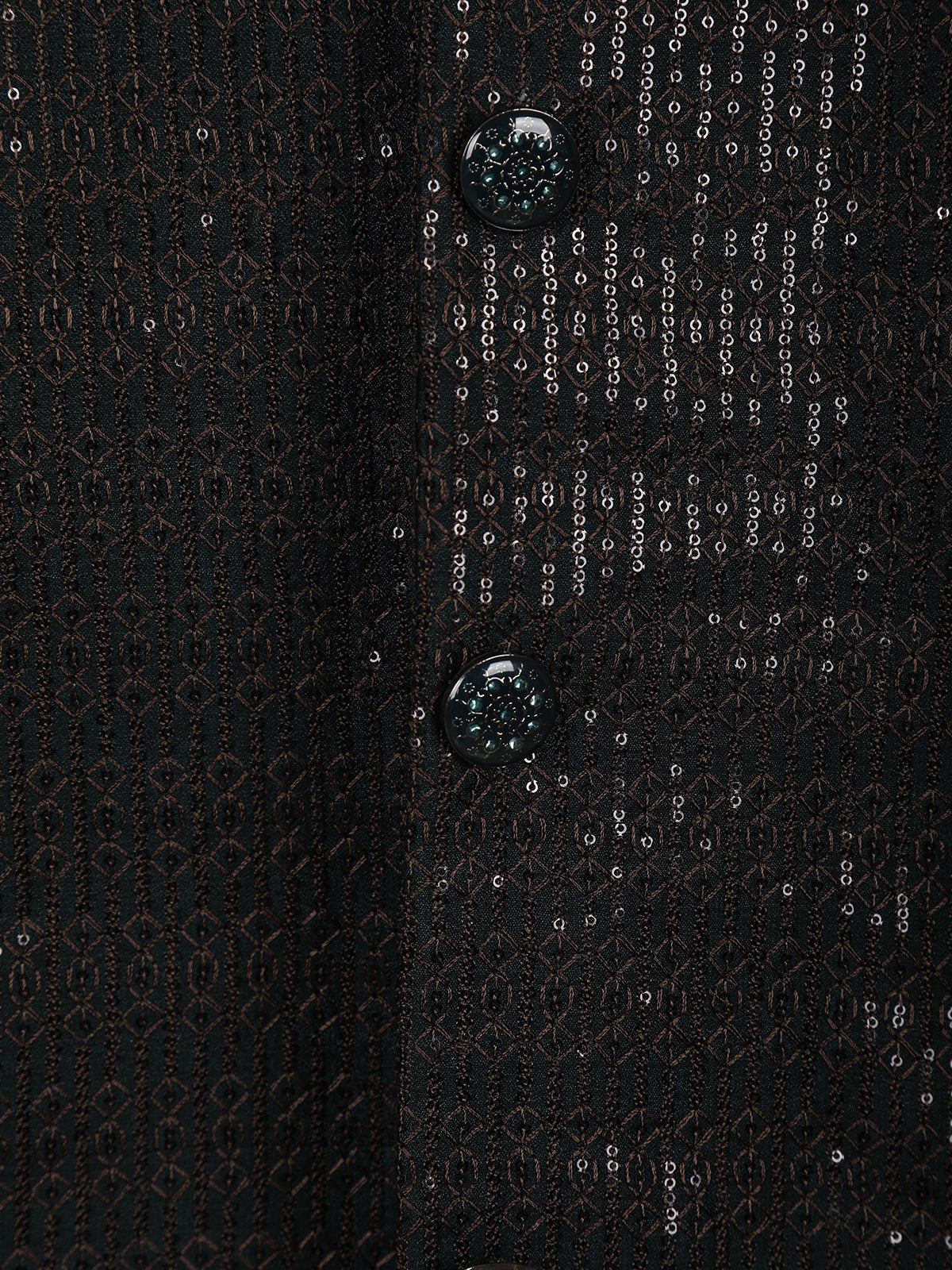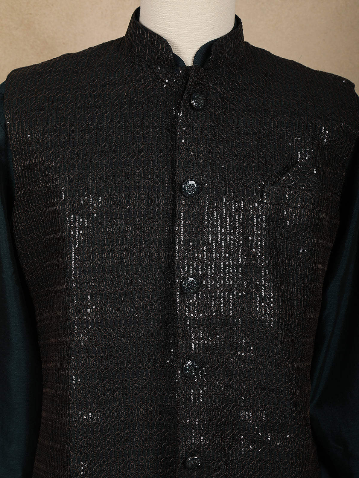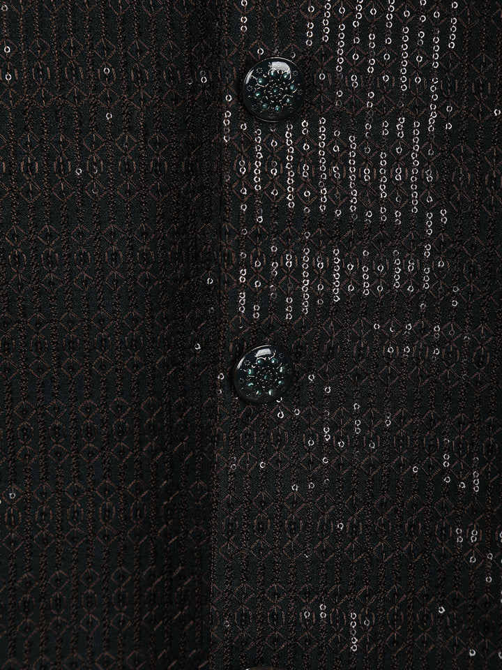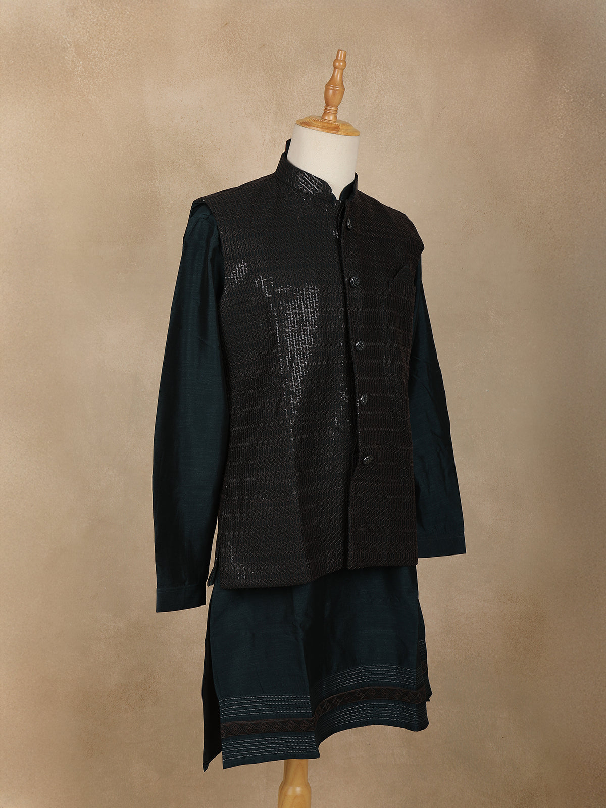 Adorned with delicate sequin work and embroidered detailing, this kurta catches the light beautifully, adding just the right amount of shimmer for special occasions. The straight-cut silhouette and Mandarin collar give it a structured, refined look that enhances the wearer’s stature and style.