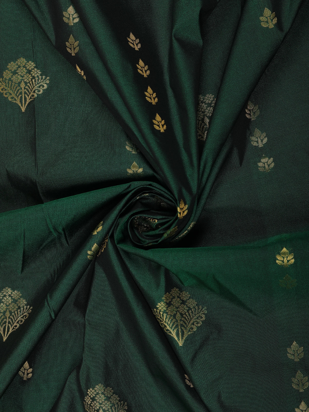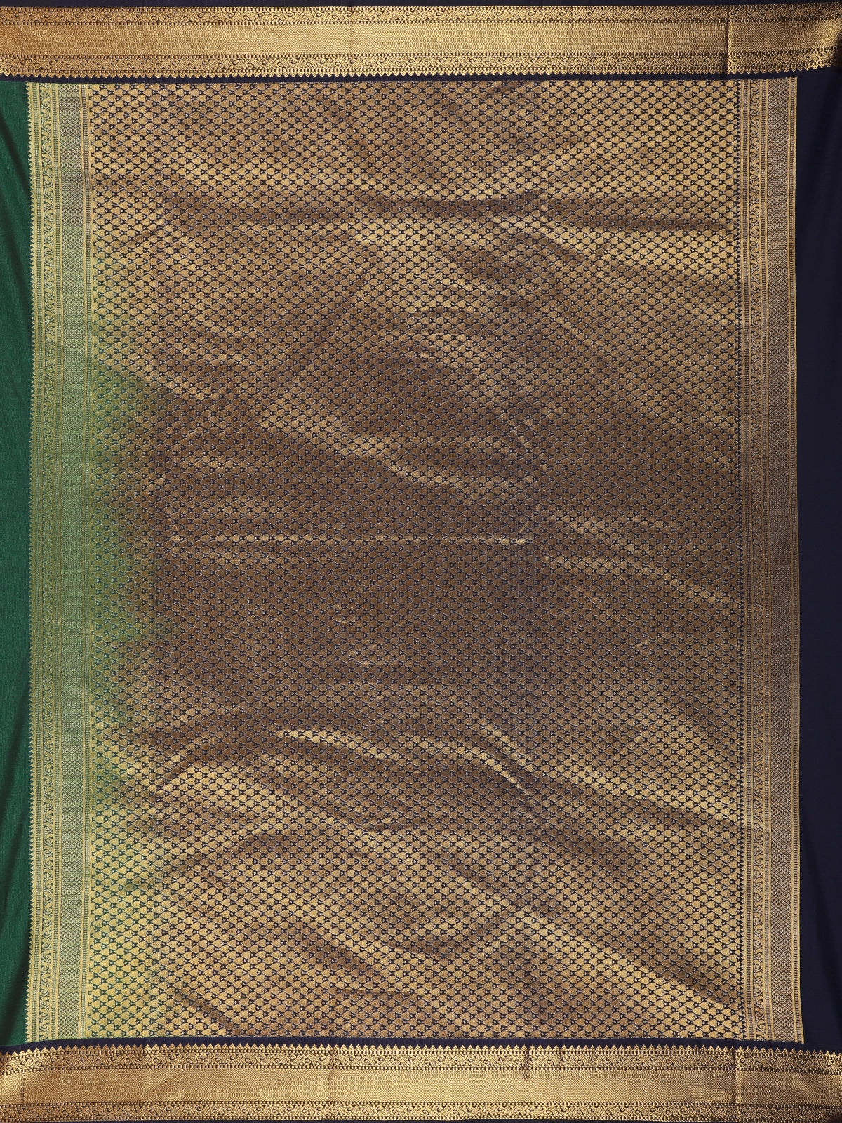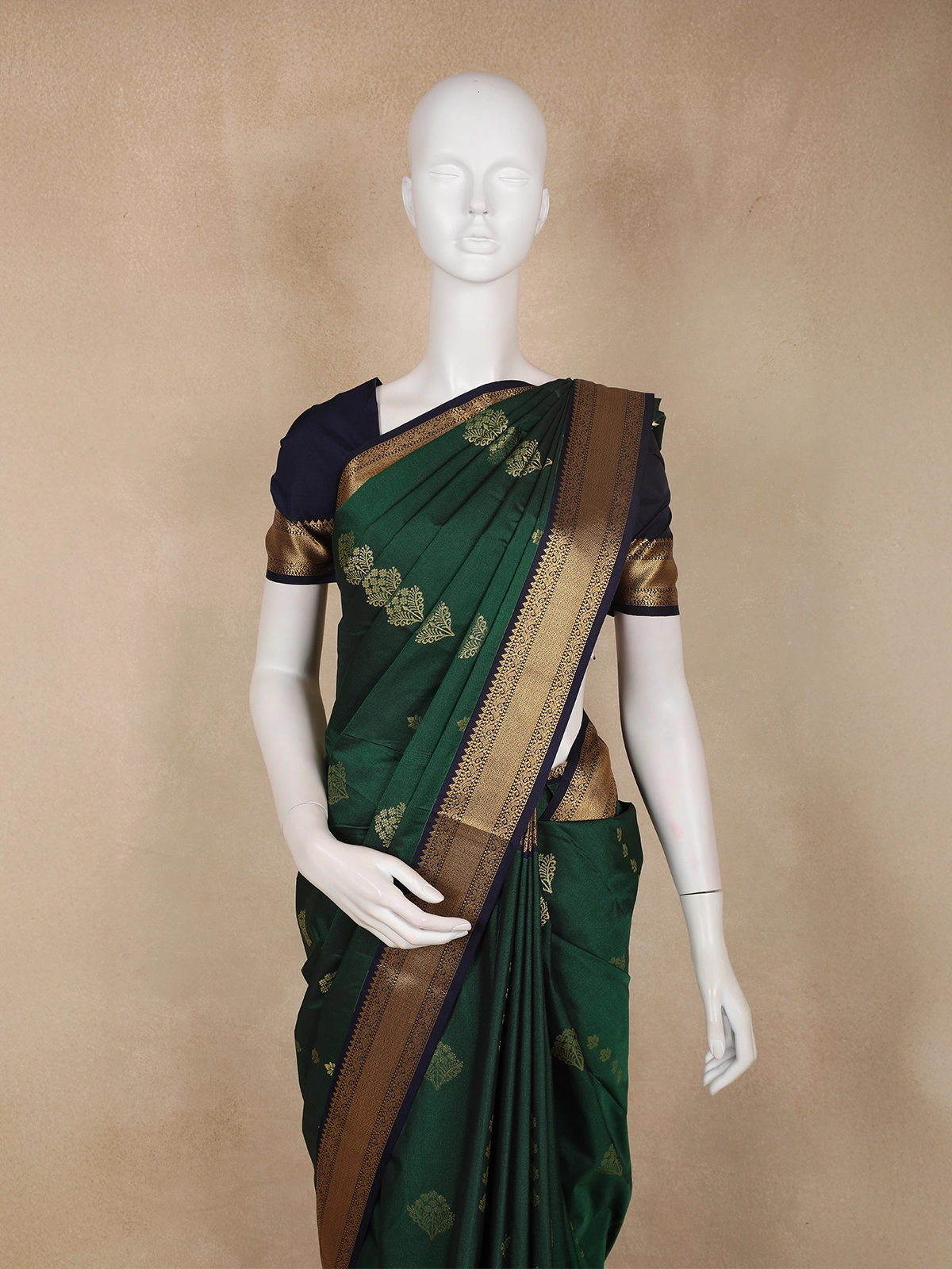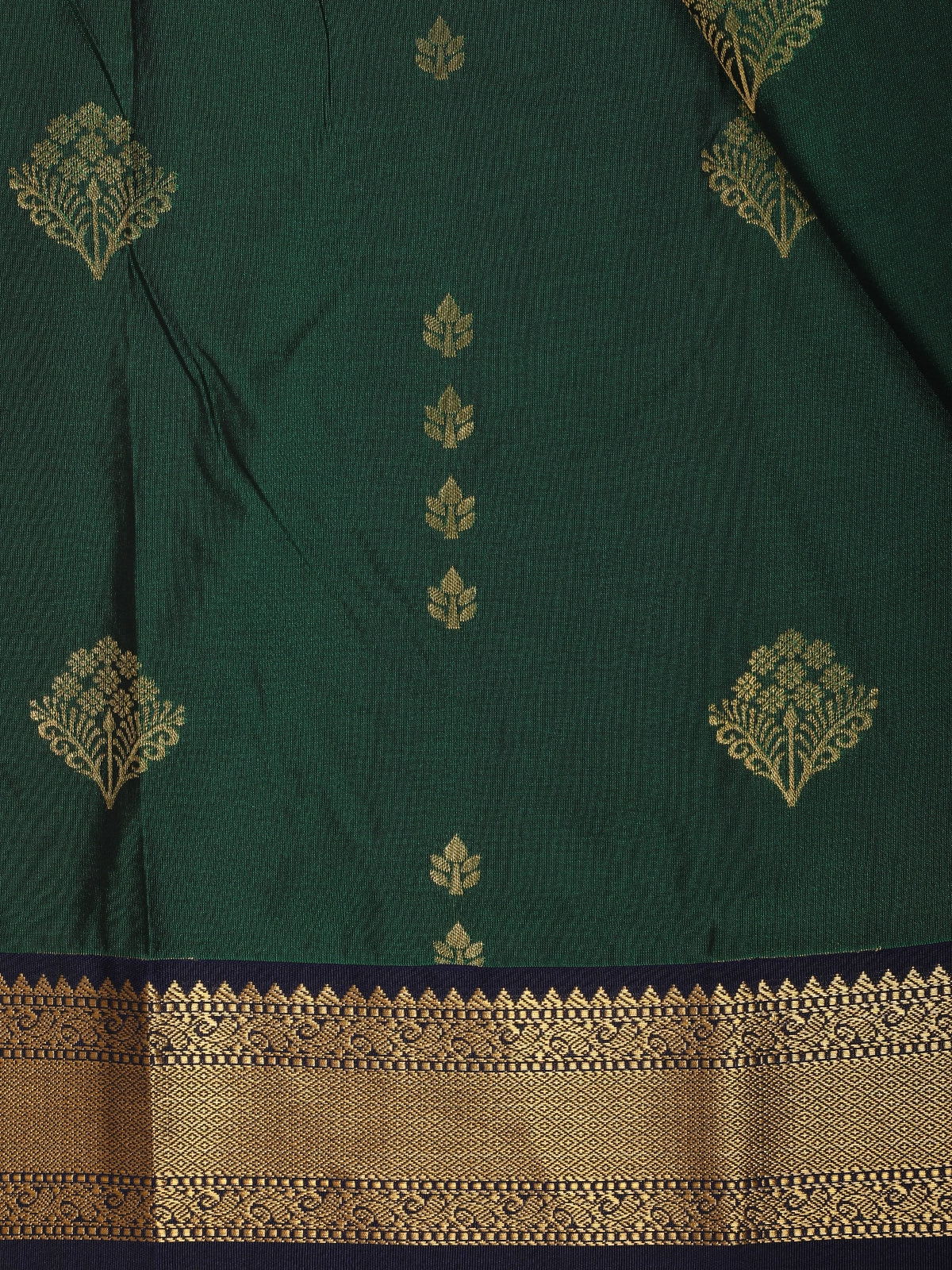The rich bottle green base is beautifully adorned with floral butta woven motifs in antique gold, adding a touch of traditional charm and delicate shimmer. A finely detailed gold zari border enhances the saree’s elegance, while the contrasting navy blue blouse with zari accents creates a striking and sophisticated finish.
