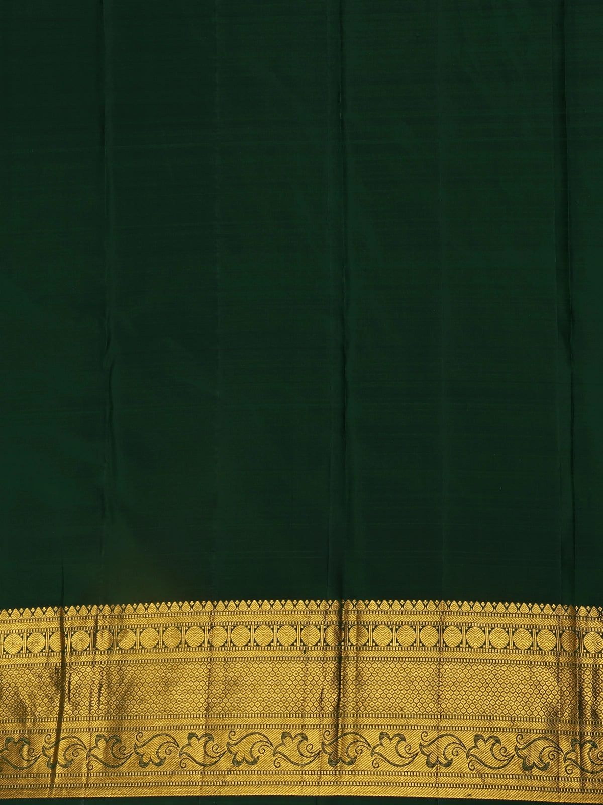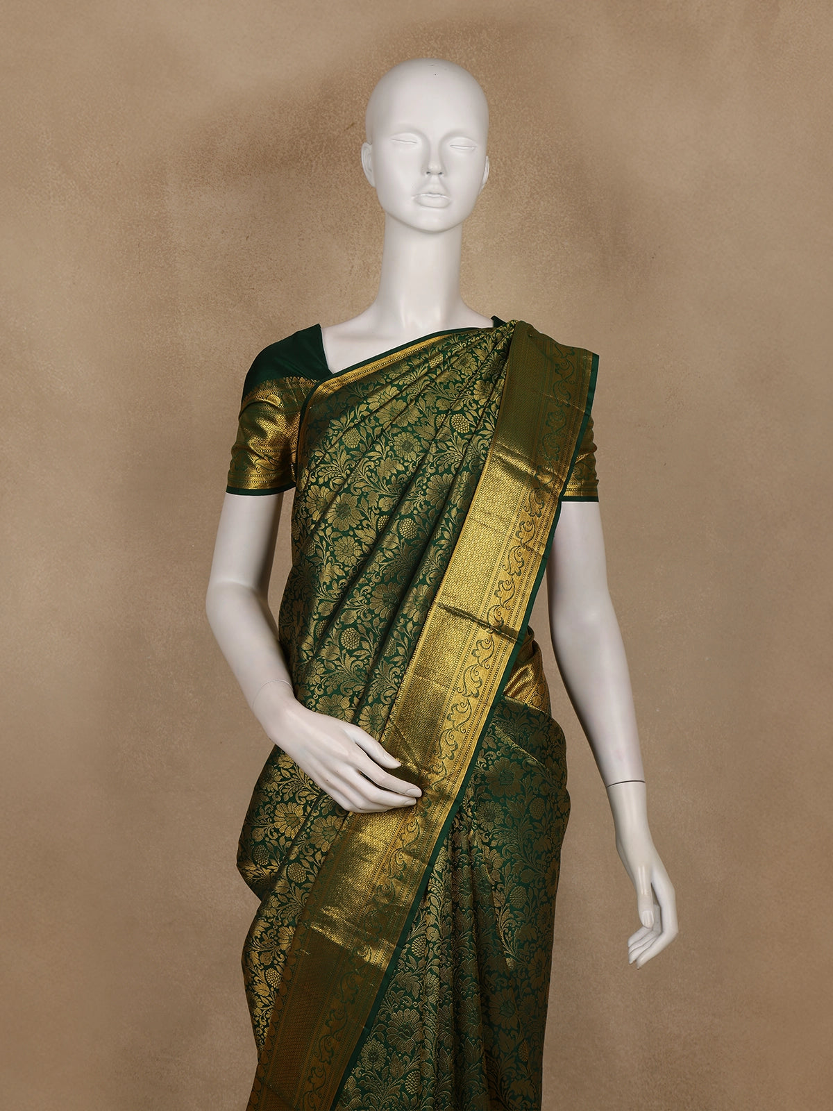 The bottle green hue enhances its regal aura, while the zari border and matching pallu add a refined touch of grandeur. Ideal for weddings, festive gatherings, and grand occasions, this saree perfectly balances tradition and elegance.