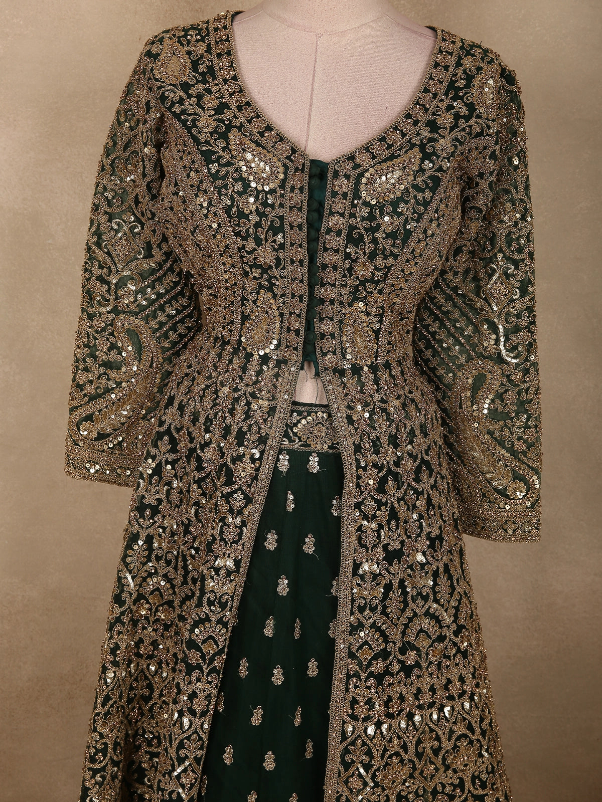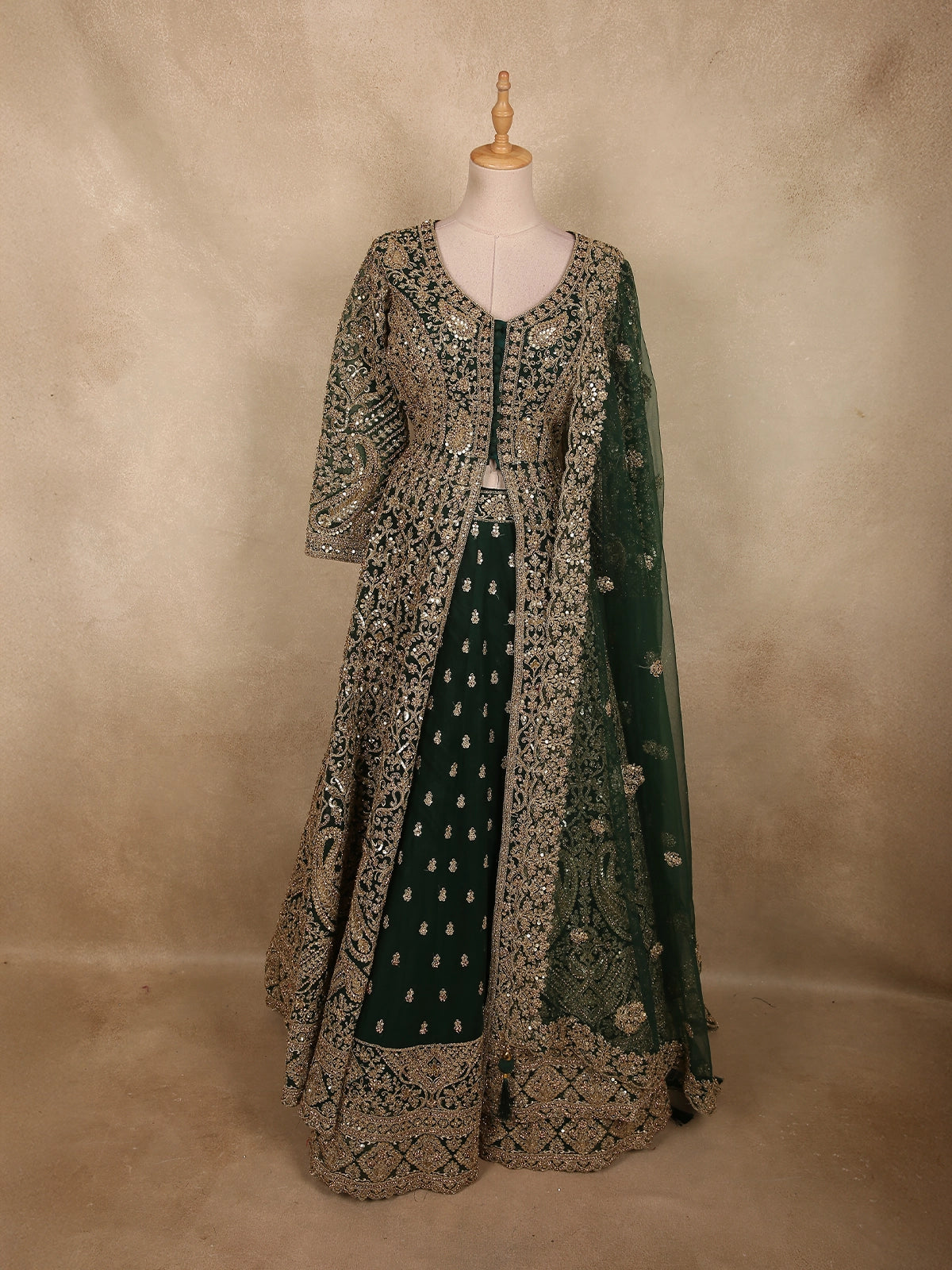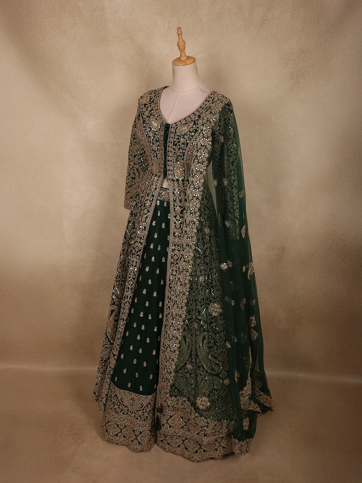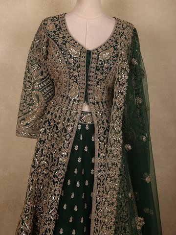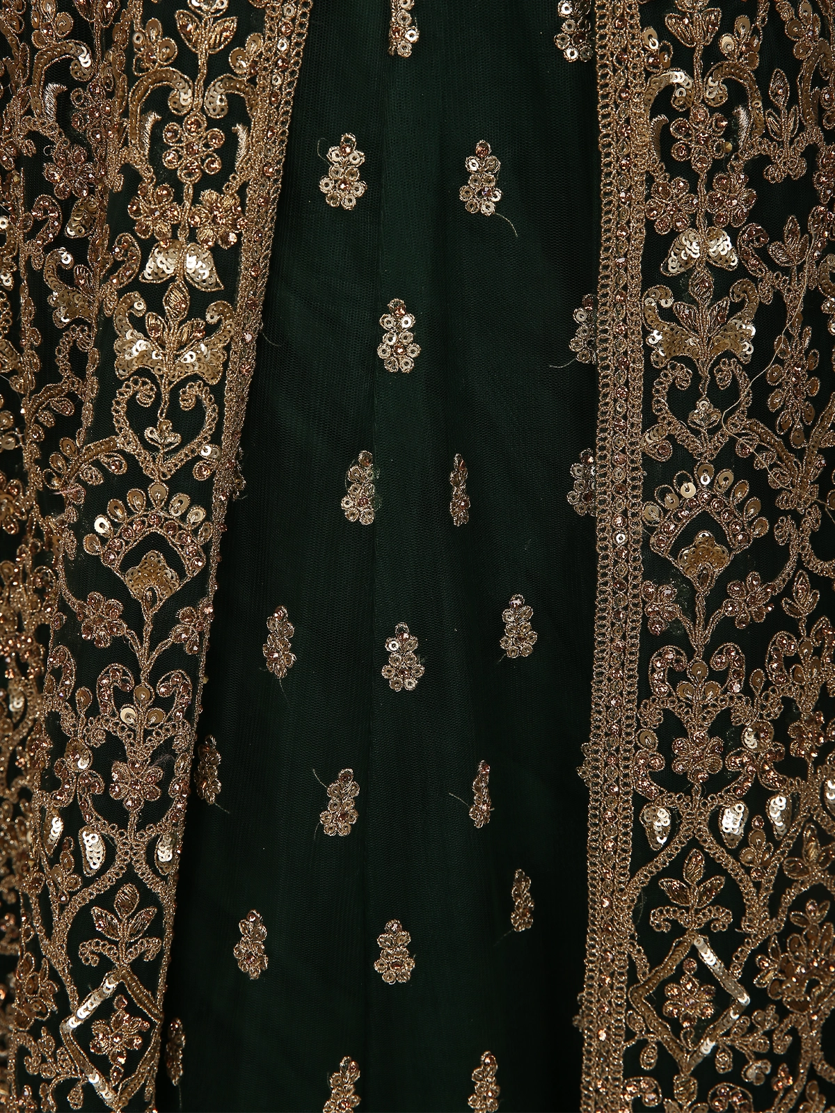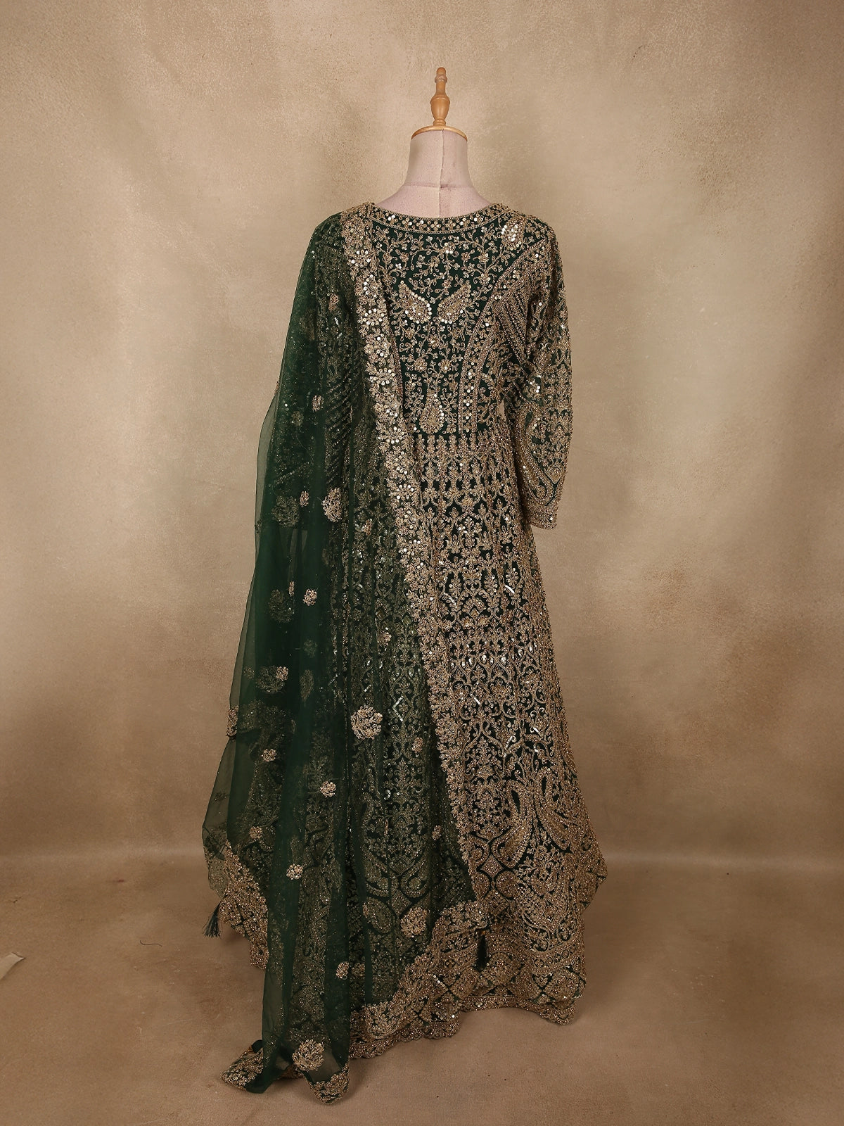 Paired with a sheer bottle green georgette dupatta, adorned with fine embroidery and soft sequin accents, the ensemble achieves a perfect harmony of richness and fluidity. The dupatta drapes effortlessly, lending a light, ethereal contrast to the detailed gown.