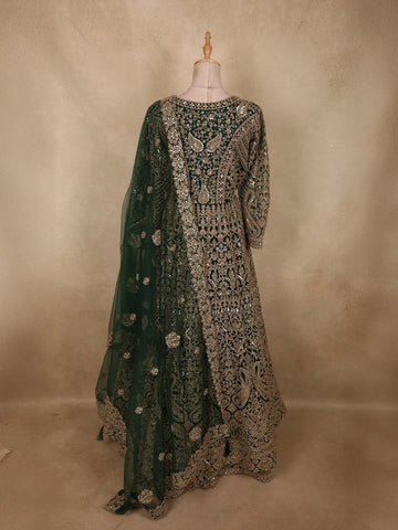 Bottle Green Floral Zari and Sequins Embroidered Design Georgette Gown with Dupatta