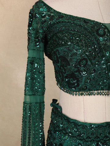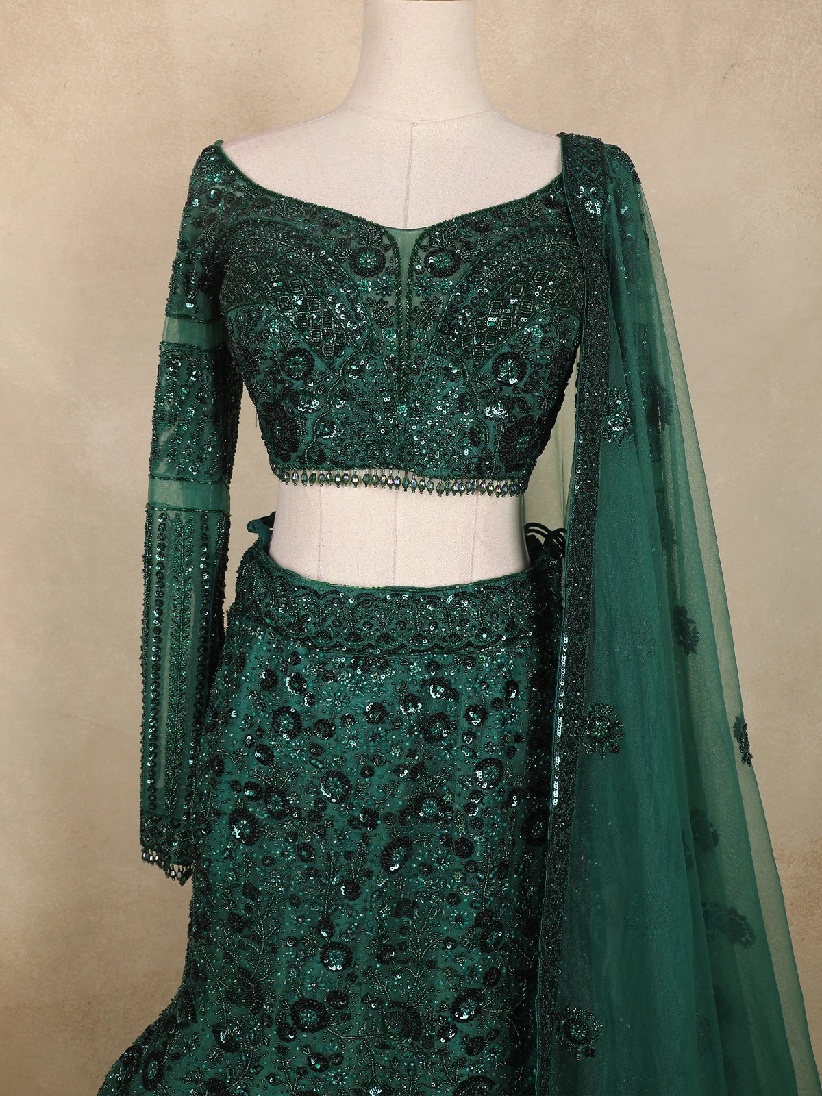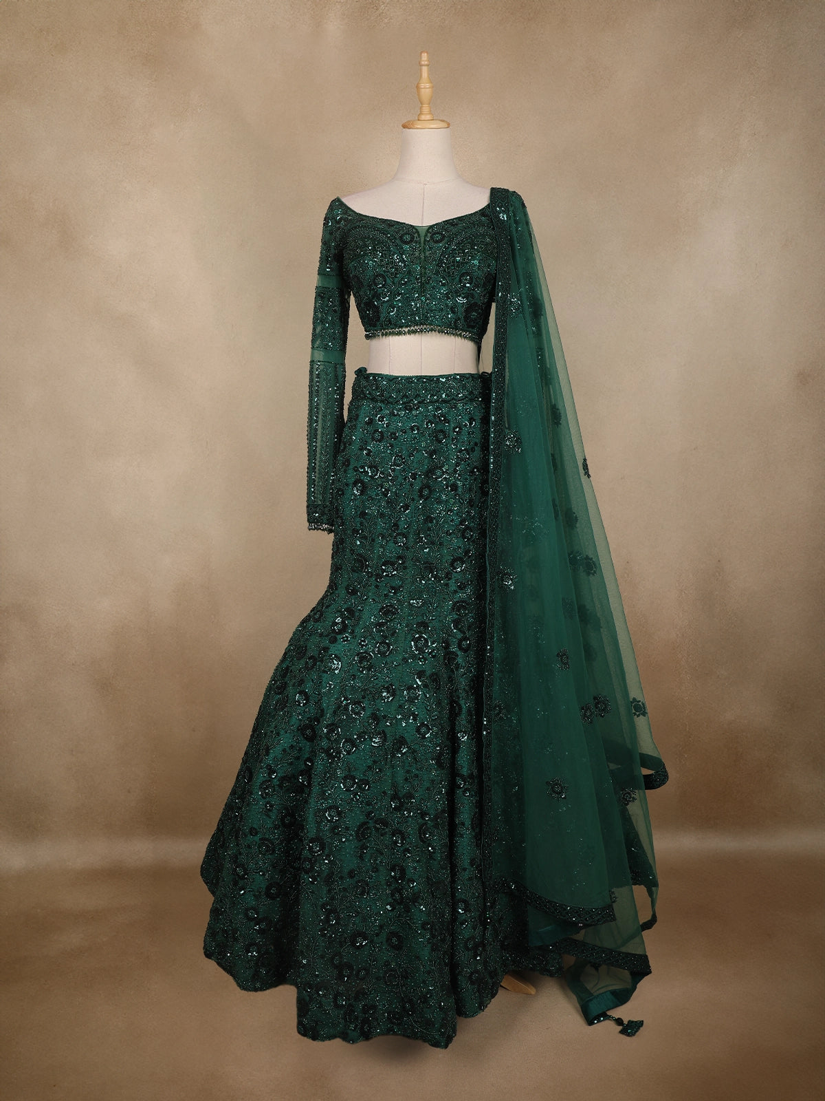Rendered in a deep bottle green hue, this lehenga beautifully captures the essence of festive luxury — ideal for receptions, sangeet nights, and glamorous celebrations.