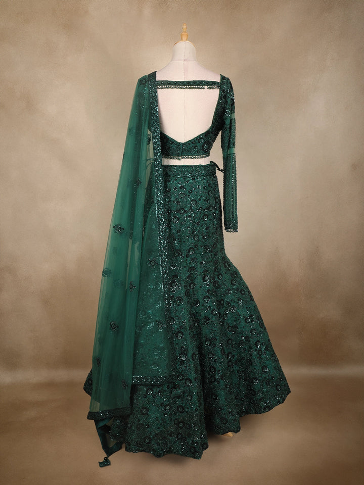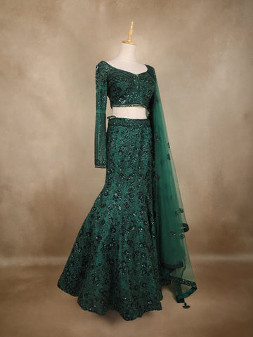 Bottle Green Heavy Sequins and Beads Embroidered Design Mermaid Net Lehenga With Dupatta