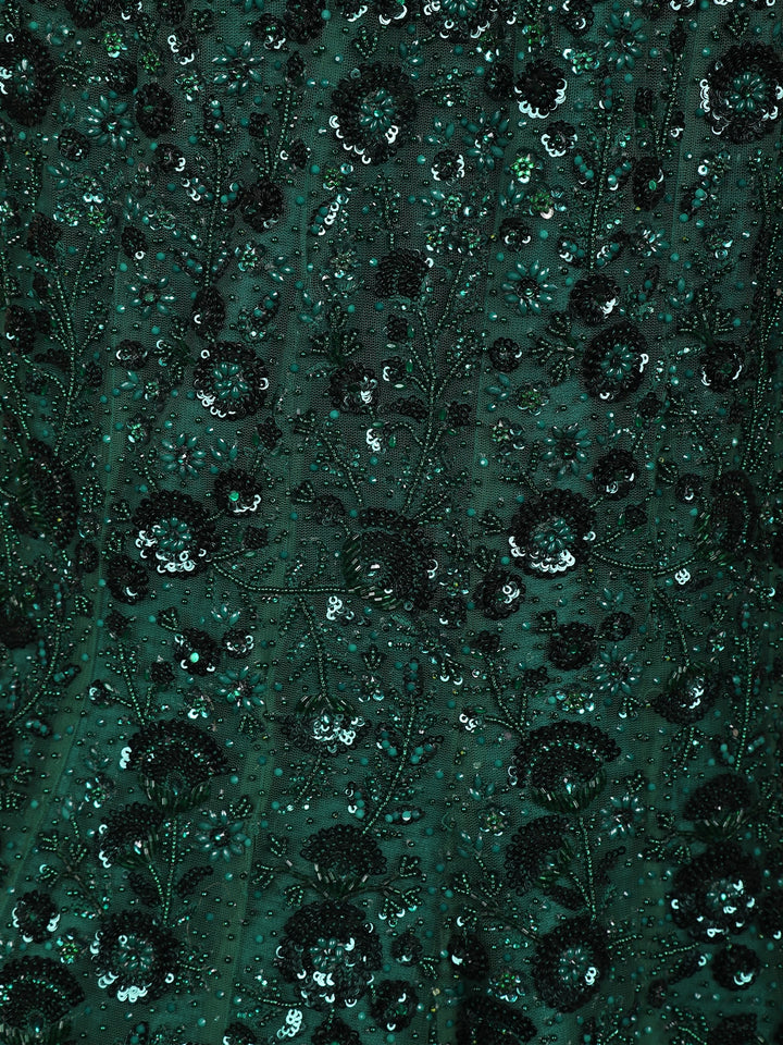 Drape yourself in opulent elegance with this Bottle Green Heavy Sequins and Beads Embroidered Net Lehenga, a statement piece designed for the modern diva with a regal flair. Crafted from luxurious net fabric, the ensemble features intricate hand embroidery with heavy sequins, beads, and thread work, creating a breathtaking shimmer effect that exudes grandeur.