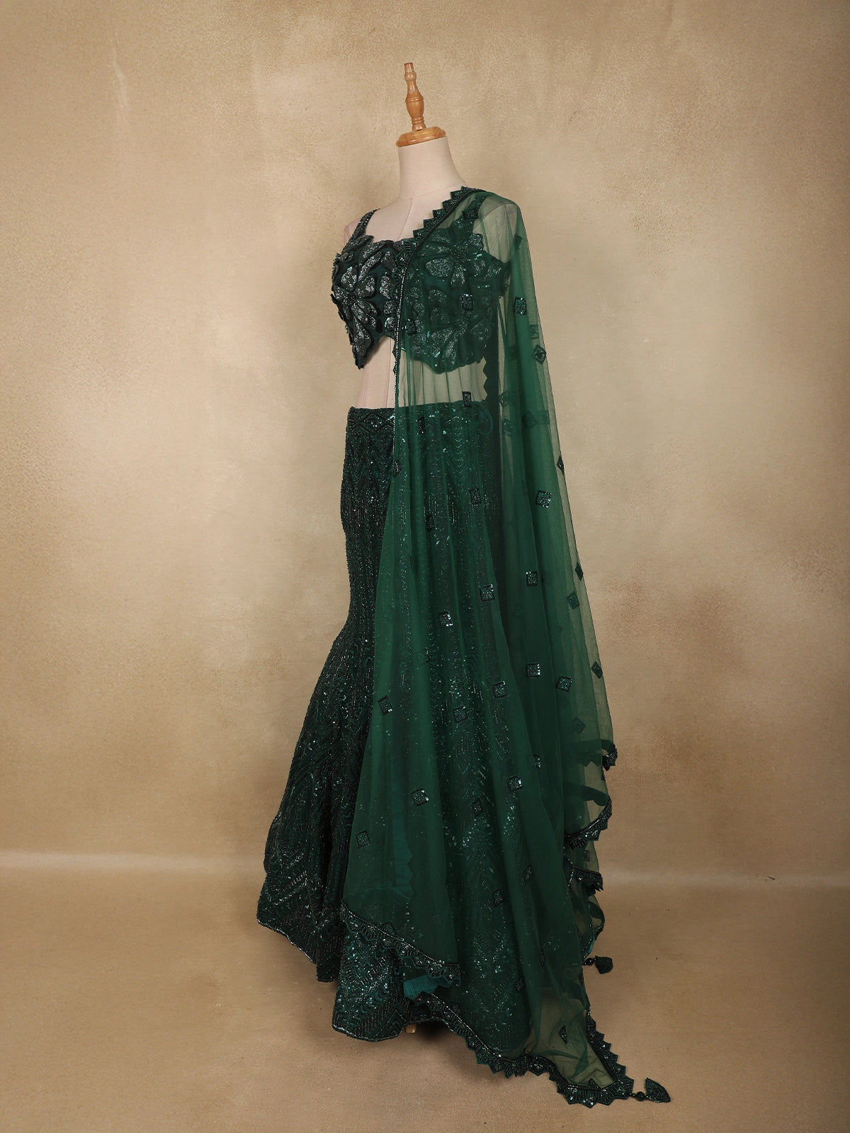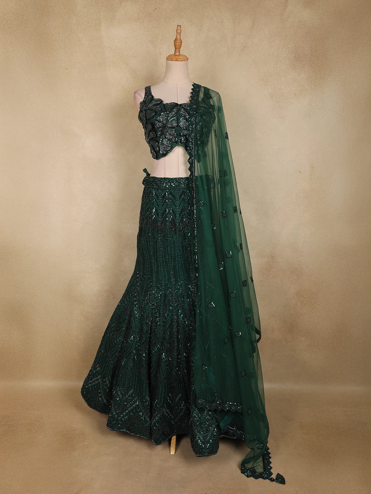 Bottle Green Heavy Sequins and Beads Embroidered Design Net Mermaid Lehenga With Dupatta