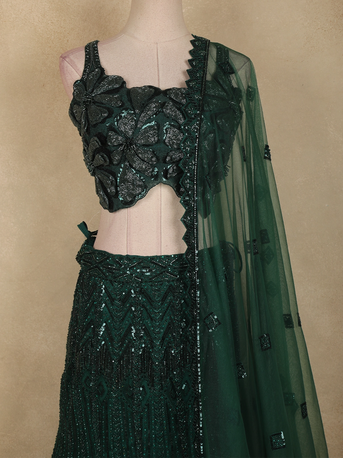 Exuding regal elegance and contemporary glamour, this Bottle Green Heavy Sequins and Beads Embroidered Net Lehenga is a statement ensemble crafted for grand celebrations. Designed in a rich bottle green hue, the outfit captures a luxurious depth that enhances its festive appeal.