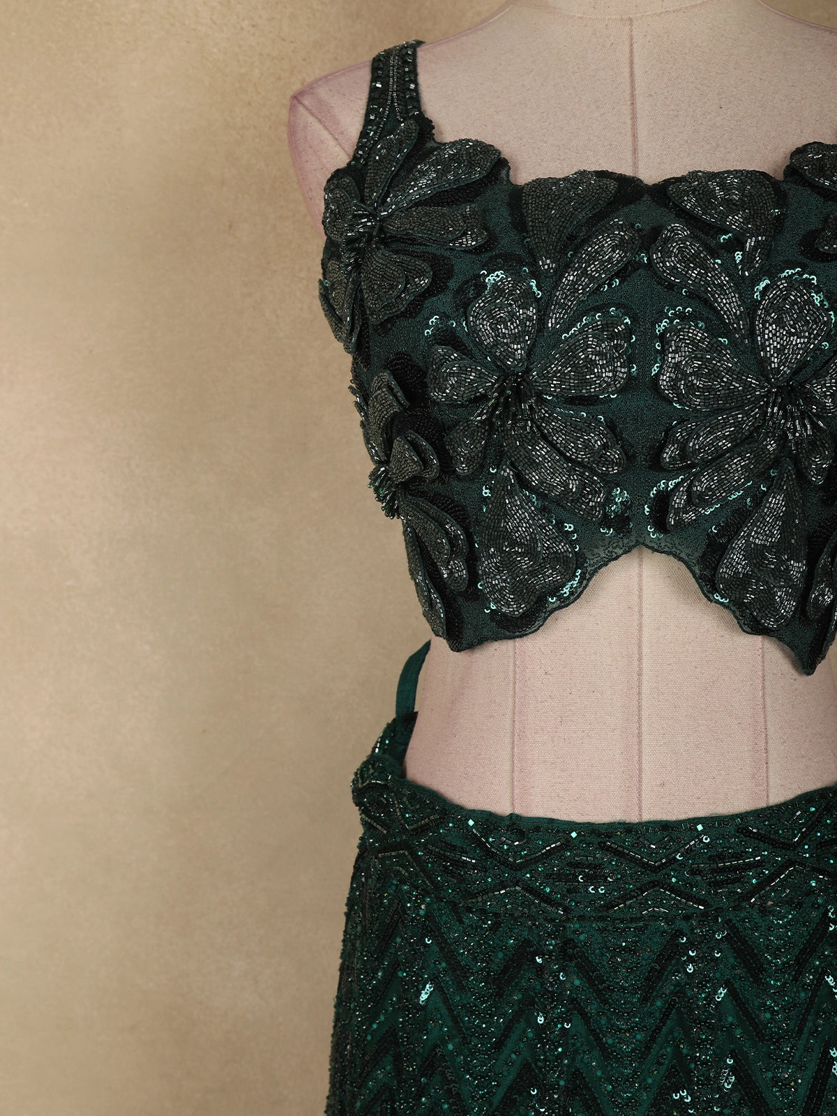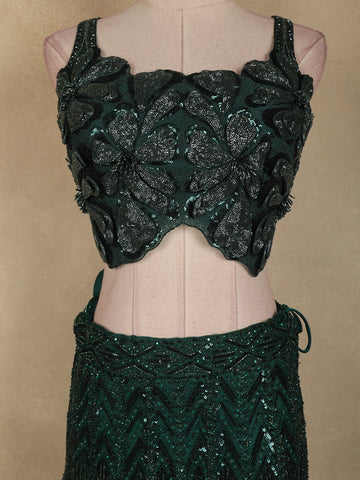 The blouse features exquisite 3D floral embroidery, richly embellished with shimmering sequins and intricate beadwork that create a textured, handcrafted finish. The structured yet graceful silhouette highlights the neckline and adds a couture-inspired charm. The lehenga skirt is beautifully adorned with heavy sequins and bead embroidery arranged in elegant chevron and linear patterns, lending movement and sparkle with every step.