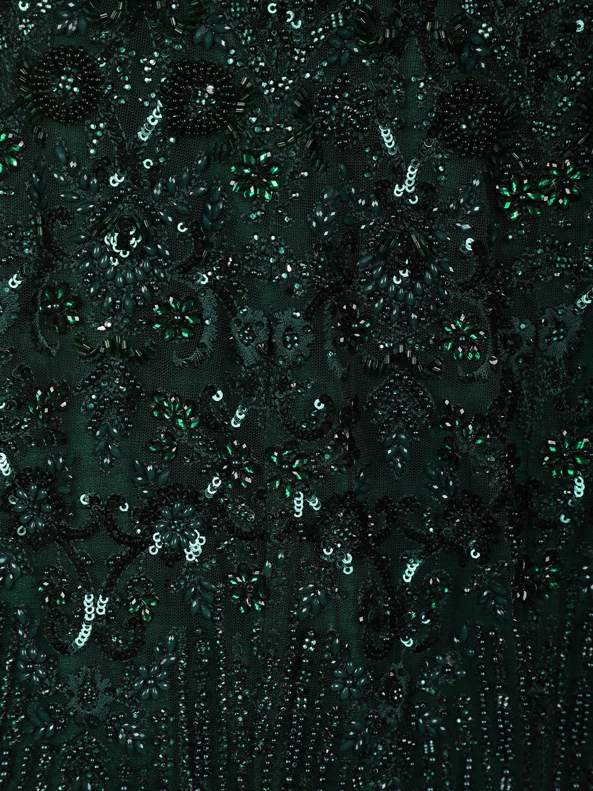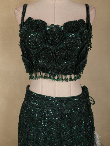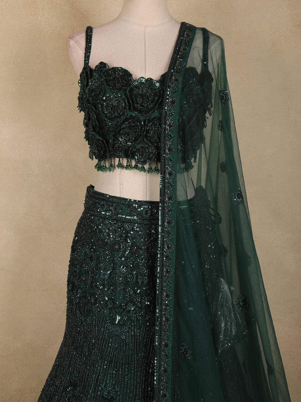 Make a striking bridal statement with this exquisite bottle green mermaid lehenga, crafted to embody grandeur and elegance. Designed in fine net fabric, this couture lehenga features heavy sequins and bead embroidery arranged in intricate floral and linear patterns, creating a luxurious shimmer with every movement.