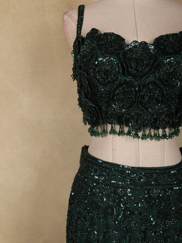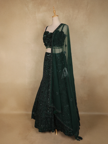 Bottle Green Heavy Sequins and Beads Embroidered Design Net Mermaid Lehenga With Dupatta