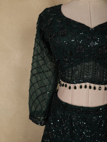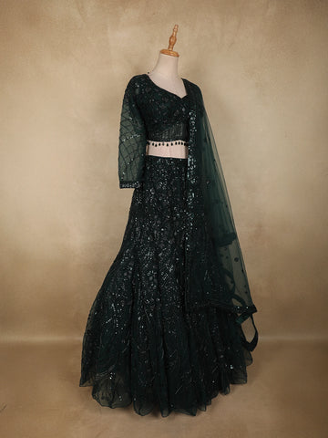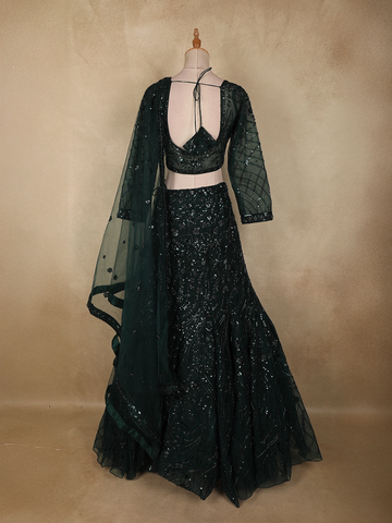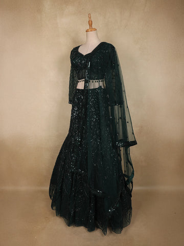 Bottle Green Heavy Sequins and Beads Embroidered Design Net Mermaid Lehenga With Dupatta