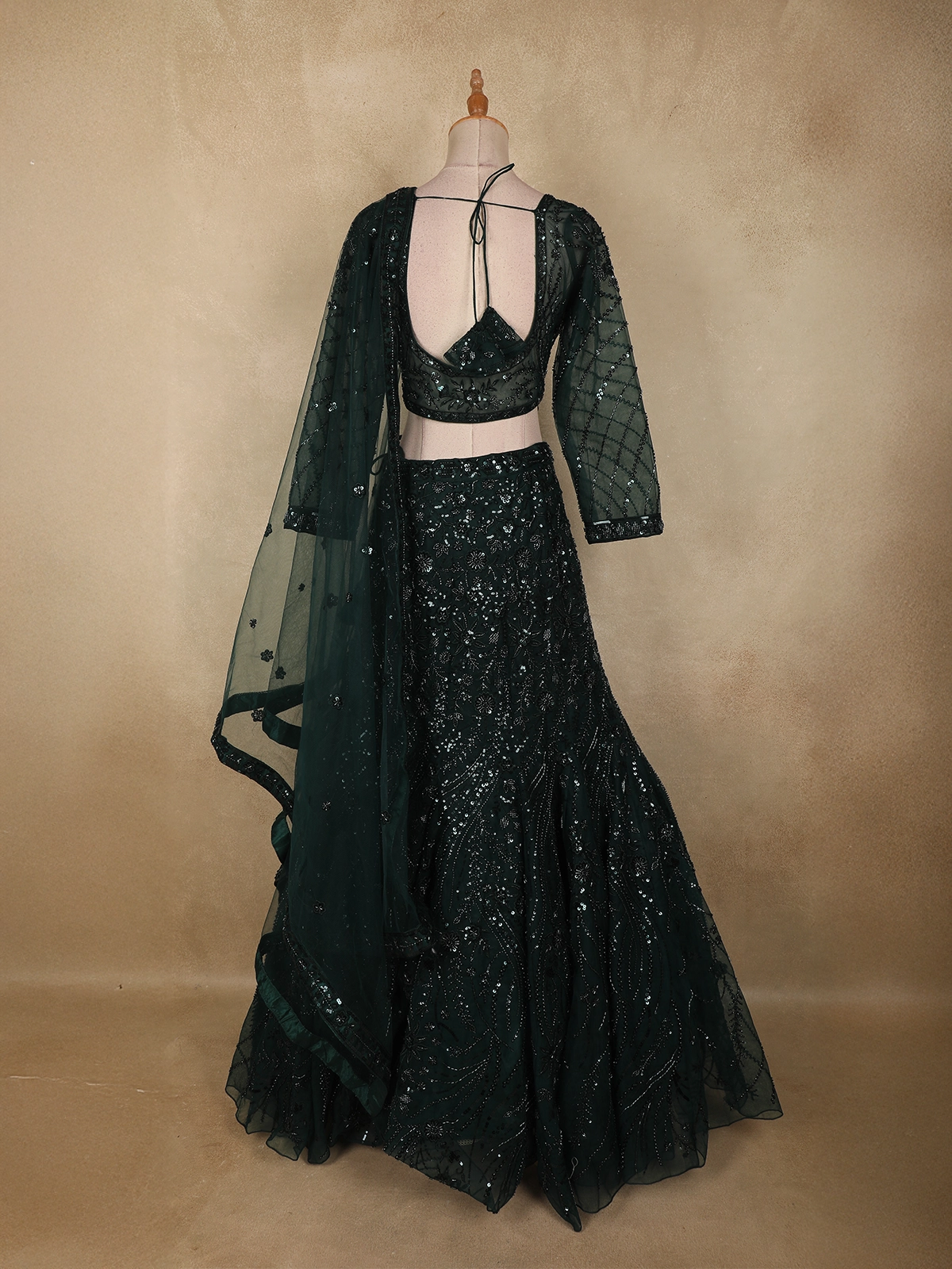 Make a striking bridal statement with this exquisite bottle green mermaid lehenga, crafted to embody grandeur and elegance. Designed in fine net fabric, this couture lehenga features heavy sequins and bead embroidery arranged in intricate floral and linear patterns, creating a luxurious shimmer with every movement.
