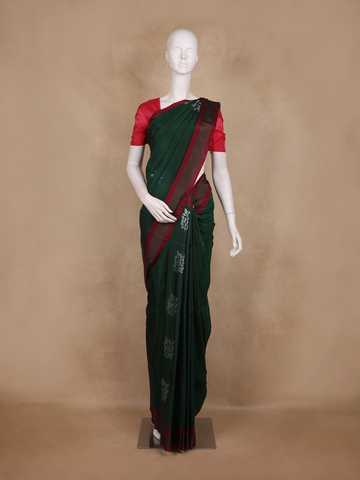 Immerse yourself in the regal charm of tradition with this Bottle Green Leaf Butta Woven Kanchipuram Silk Saree, a masterpiece of timeless artistry. The deep green hue evokes a sense of sophistication, while the delicately woven silver leaf buttas glimmer elegantly across the body, creating a graceful play of texture and light.