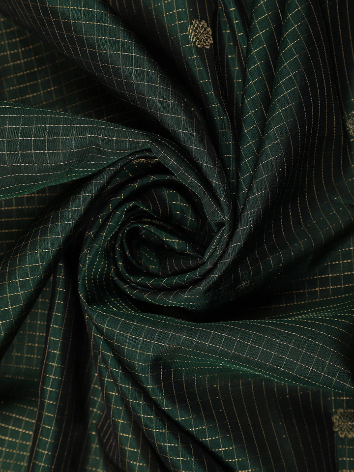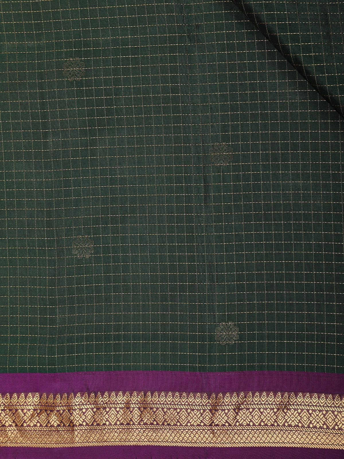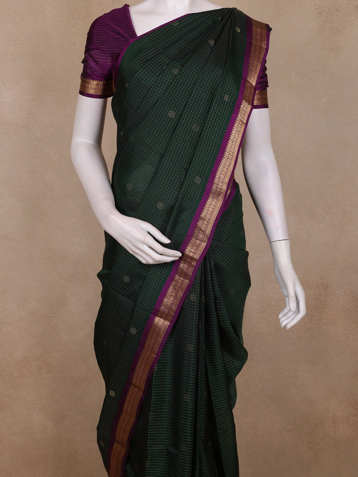 Bottle Green Mini Checks with Floral Woven Design Pure Kanchipuram Silk Saree with Contrast Purple Border
