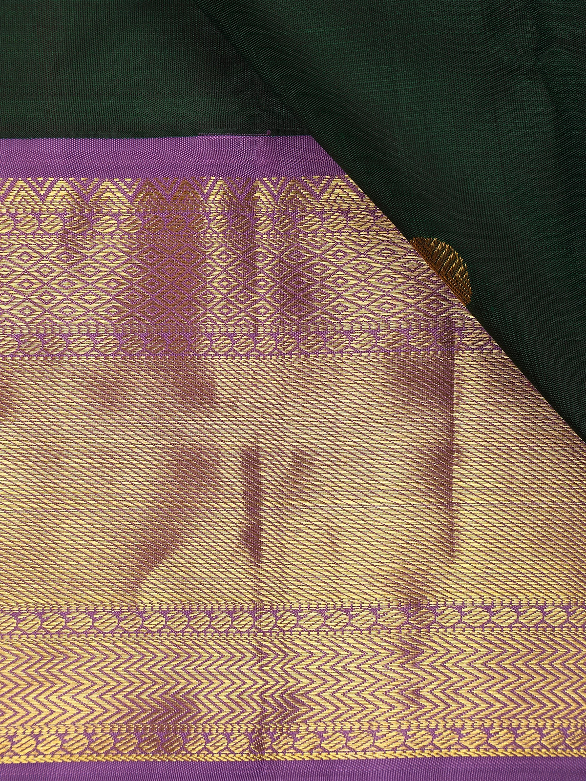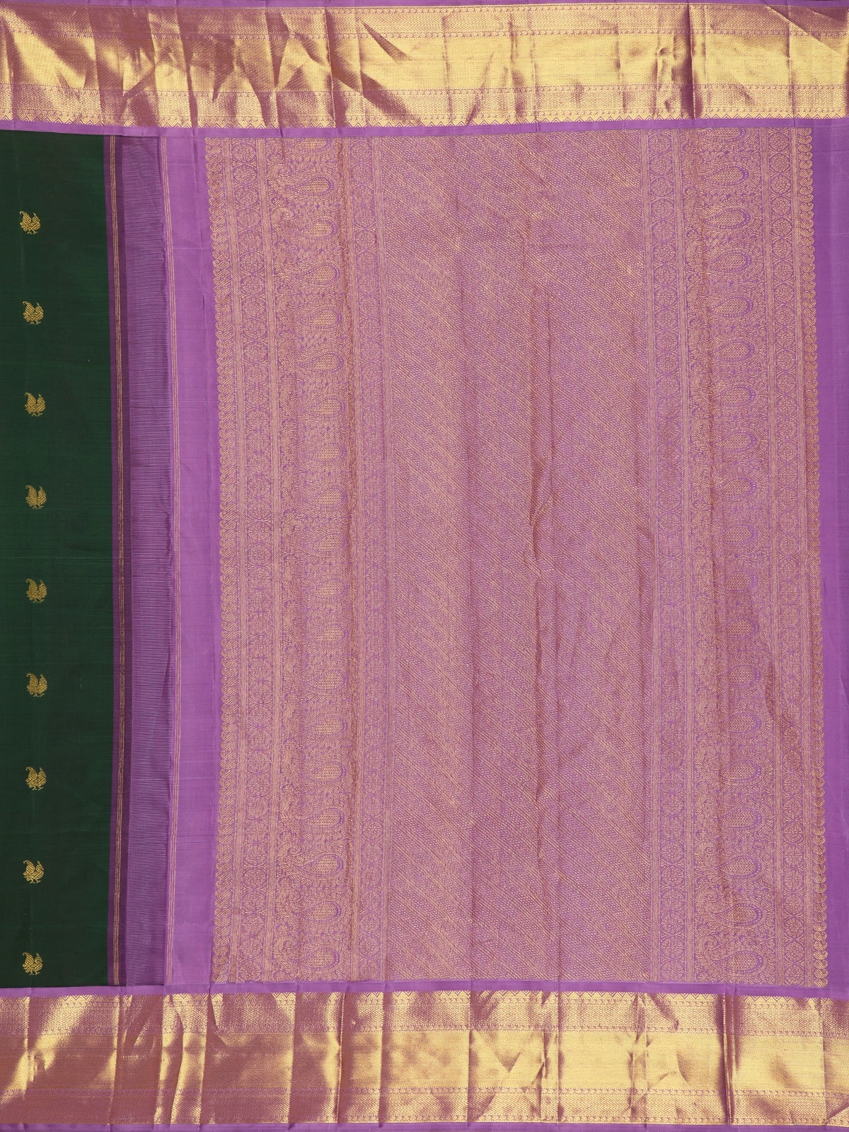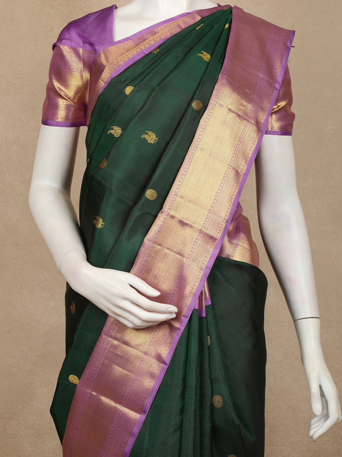 Bottle Green Peacock Butta Woven Pure Kanchipuram Silk Saree with Contrast Purple Zari Border