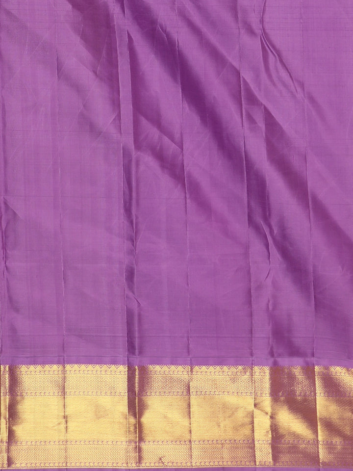 The saree features a striking contrast purple pallu, embellished with intricate gold zari detailing that enhances the luxurious look. The classic zari border frames the saree beautifully, adding a festive glow — making it ideal for weddings, traditional functions, and grand celebrations.