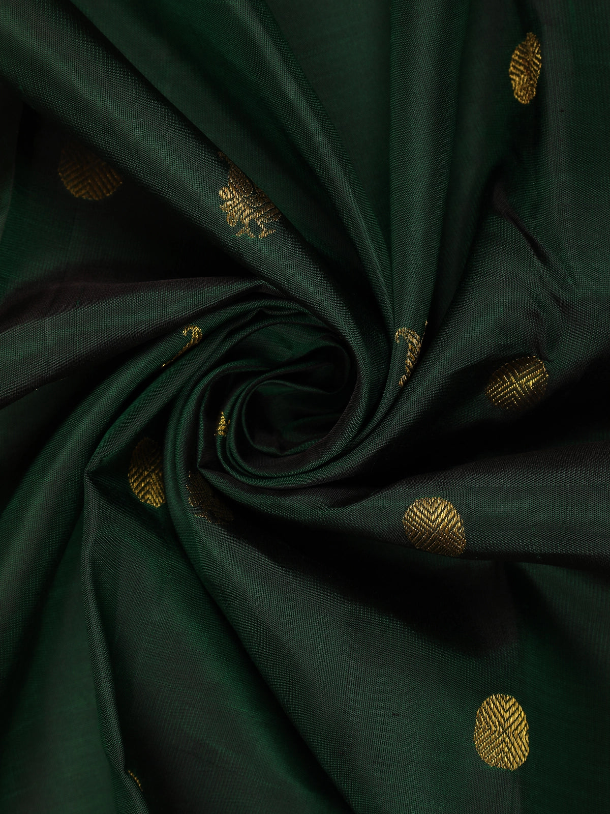 Celebrate timeless elegance with this Bottle Green Pure Kanchipuram Silk Saree adorned with beautiful gold peacock buttas. The rich, deep green body offers a graceful and regal appeal, complementing the shimmering zari motifs perfectly.