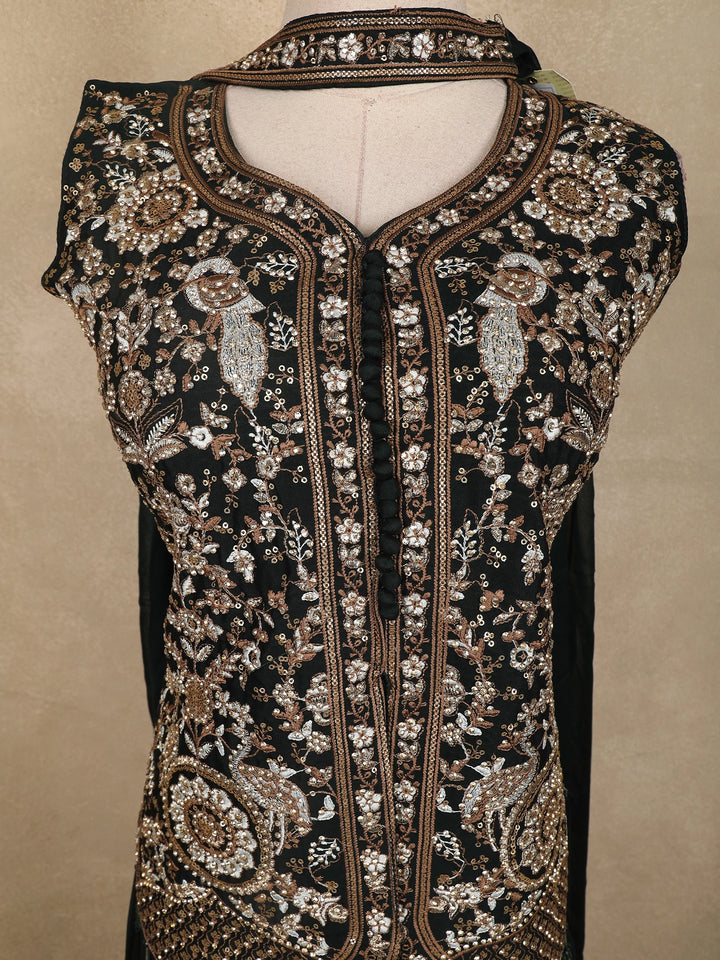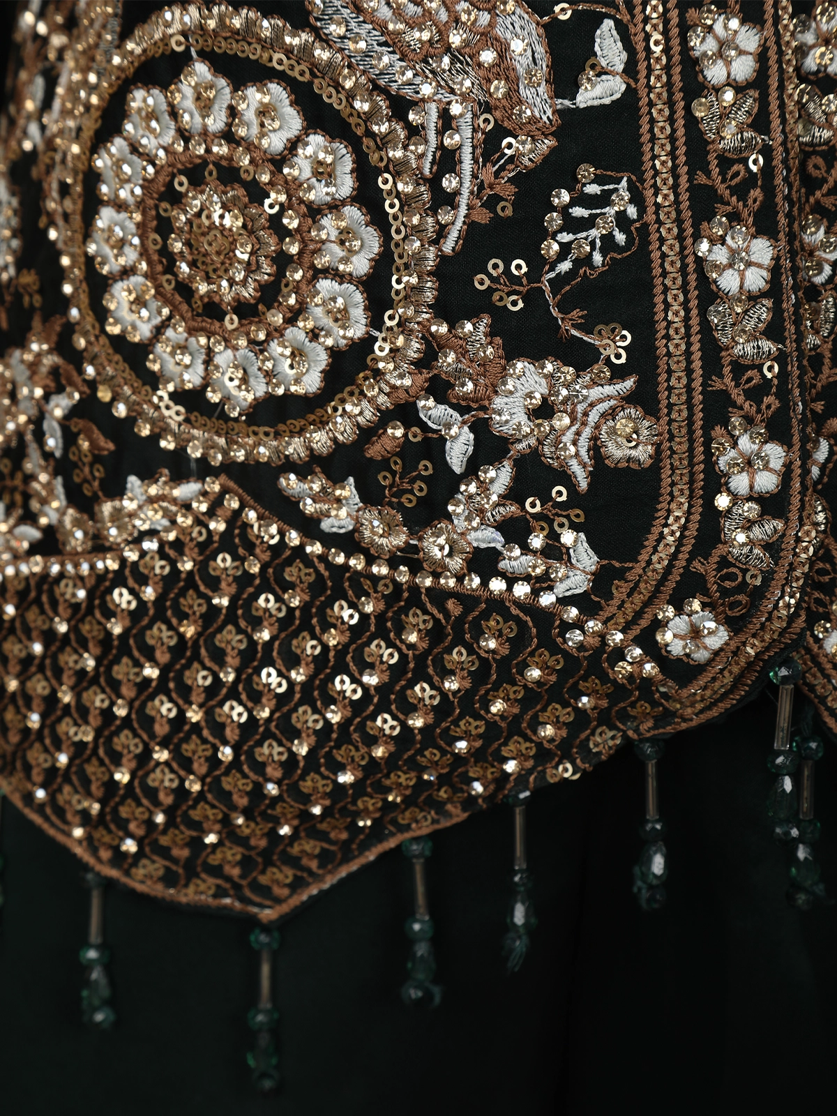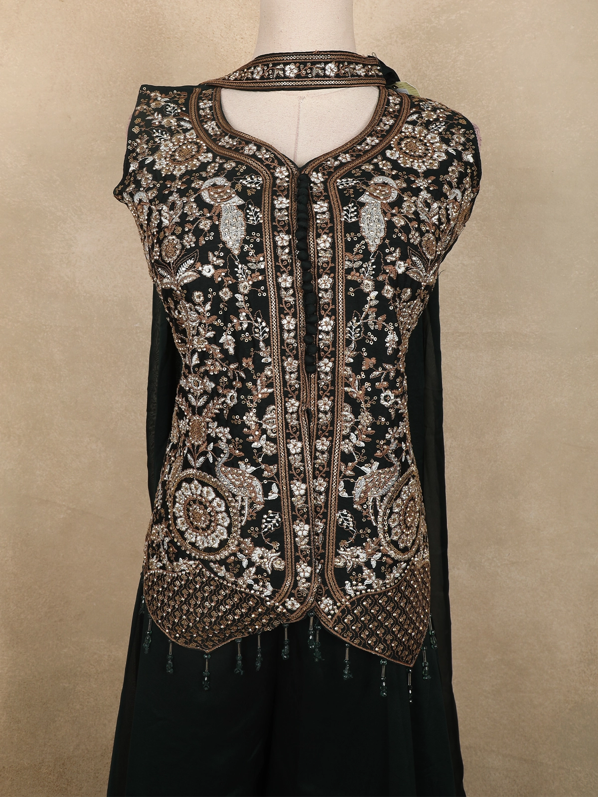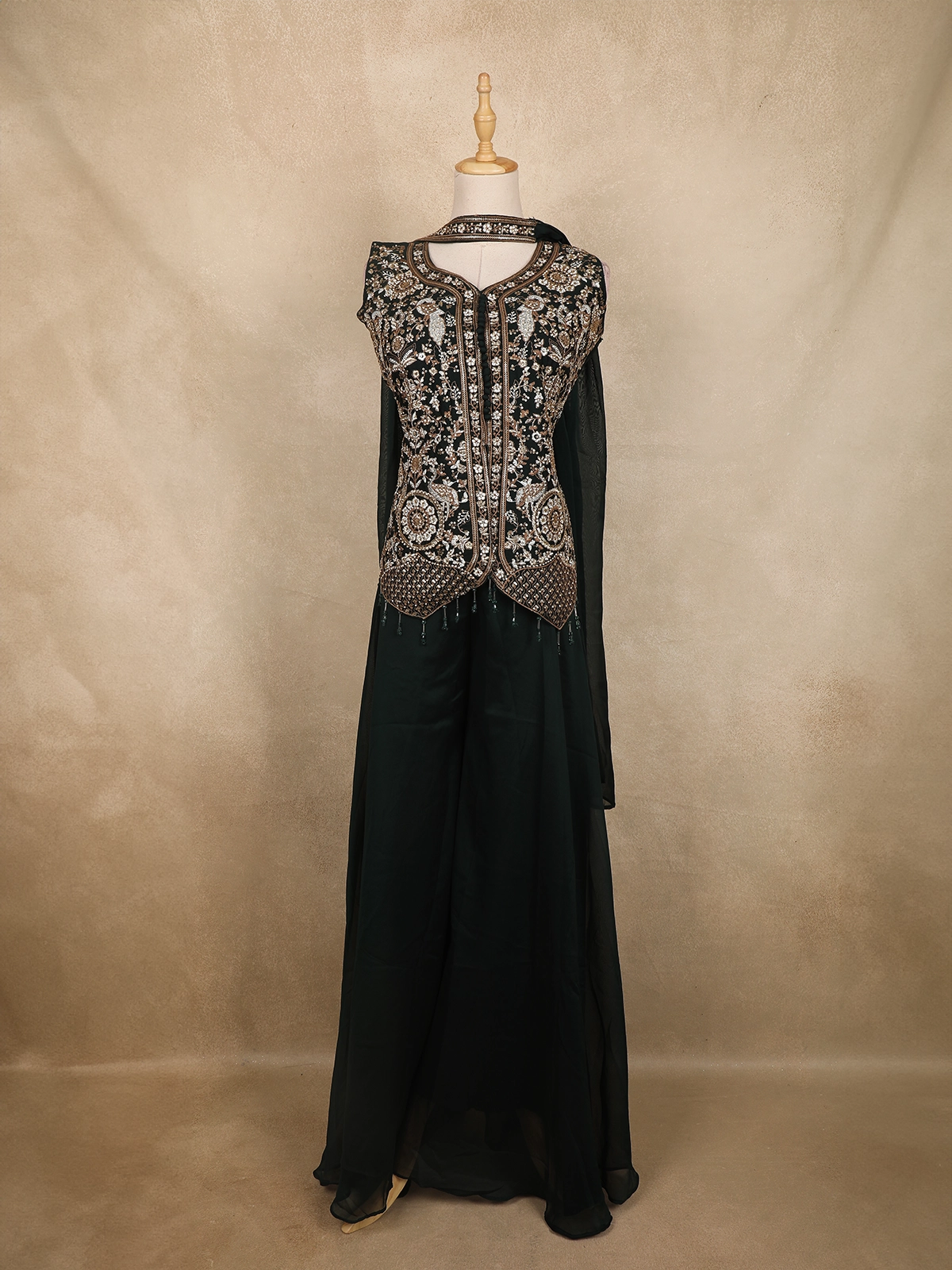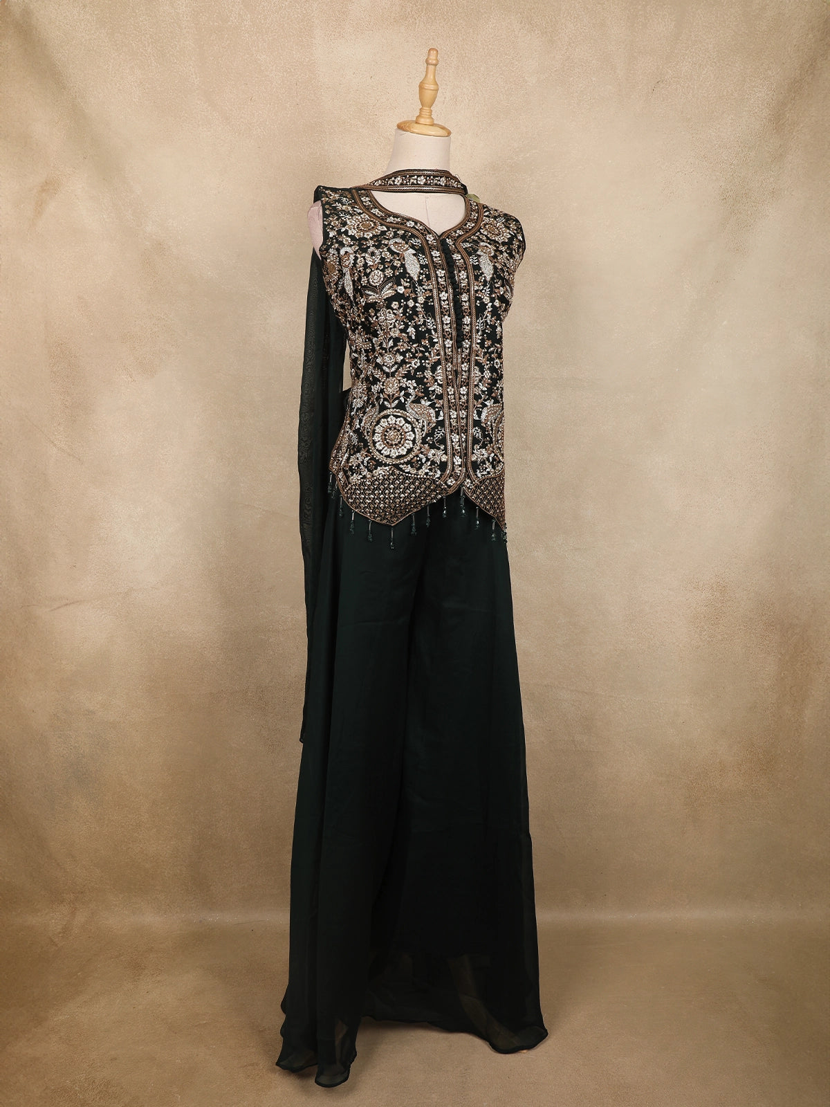Elevate your festive wardrobe with this stunning Bottle Green Georgette Palazzo Suit, designed for occasions that call for elegance with a touch of glamour. The outfit features a beautifully detailed sleeveless jacket-style kurti, richly adorned with sequins, beads, and thread embroidery in intricate floral and motif patterns. The embellishment placement enhances the silhouette, giving a refined and regal finish.