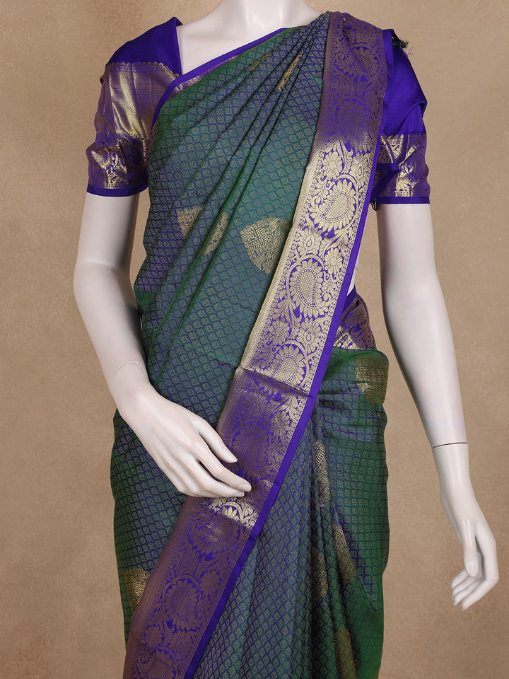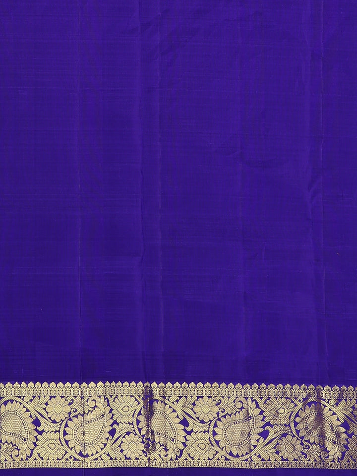 The saree is elevated by a contrast violet border, adorned with intricate floral and paisley zari motifs, adding an air of sophistication. The violet pallu gleams with lavish zari patterns, harmoniously blending with the contrast violet blouse detailed with zari borders for a cohesive royal look.