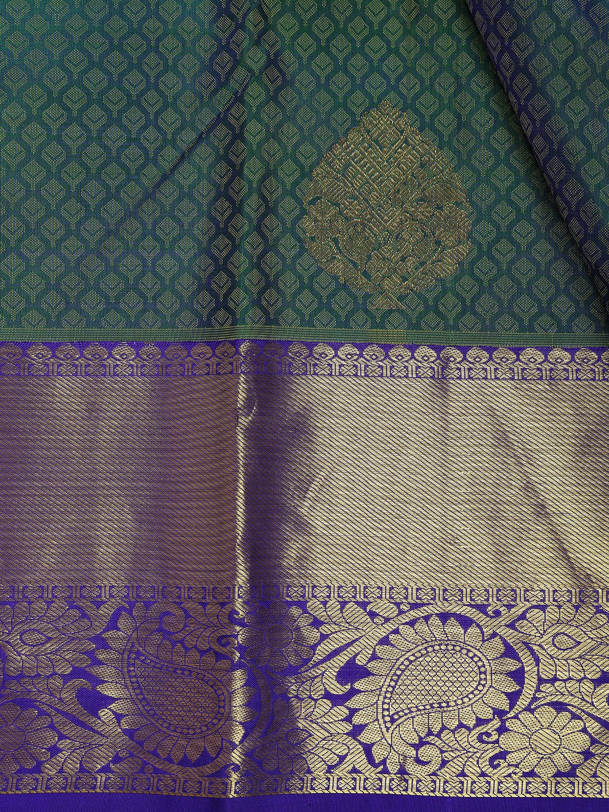 Emanate regal elegance with this stunning Bottle Green Kanchipuram Silk Saree, intricately woven with small butta motifs that shimmer with timeless grace. The deep green body radiates richness, beautifully enhanced by luxurious gold zari weaving that reflects the grandeur of traditional South Indian craftsmanship.