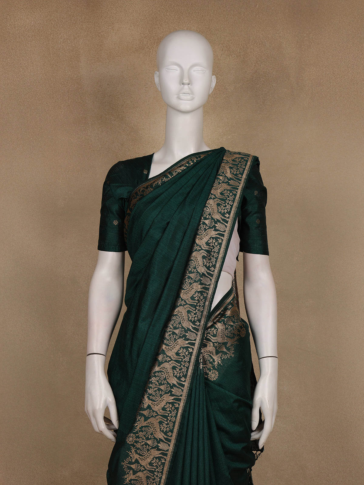 Grace meets simplicity in this exquisite Bottle Green Raw Silk Saree, radiating an understated yet regal charm. The saree features a solid woven texture that accentuates the natural sheen of raw silk, giving it a luxurious drape and rich feel. The elegant zari border adds a touch of traditional sophistication with its subtle shimmer, making it ideal for festive and semi-formal occasions. Paired with a matching blouse and coordinated pallu, this saree exudes effortless grace suitable for both day and evening events.