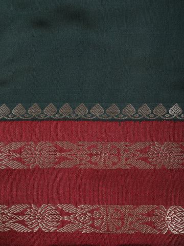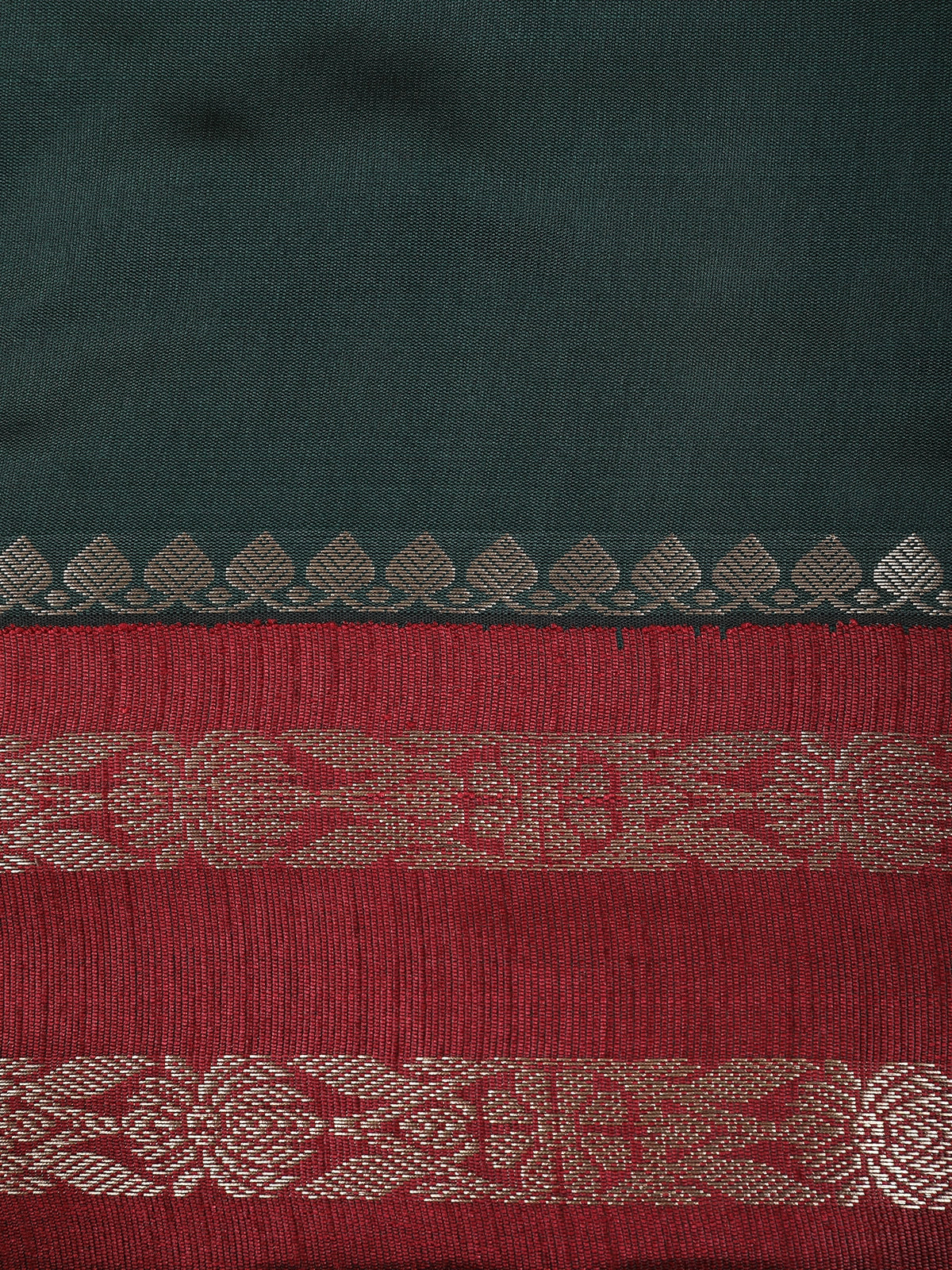 The saree is beautifully complemented by a contrast red border, intricately woven with delicate silver zari motifs, adding a refined traditional touch while keeping the overall look minimal and classy. The solid design highlights the richness of the silk and makes this saree a versatile choice for multiple occasions.