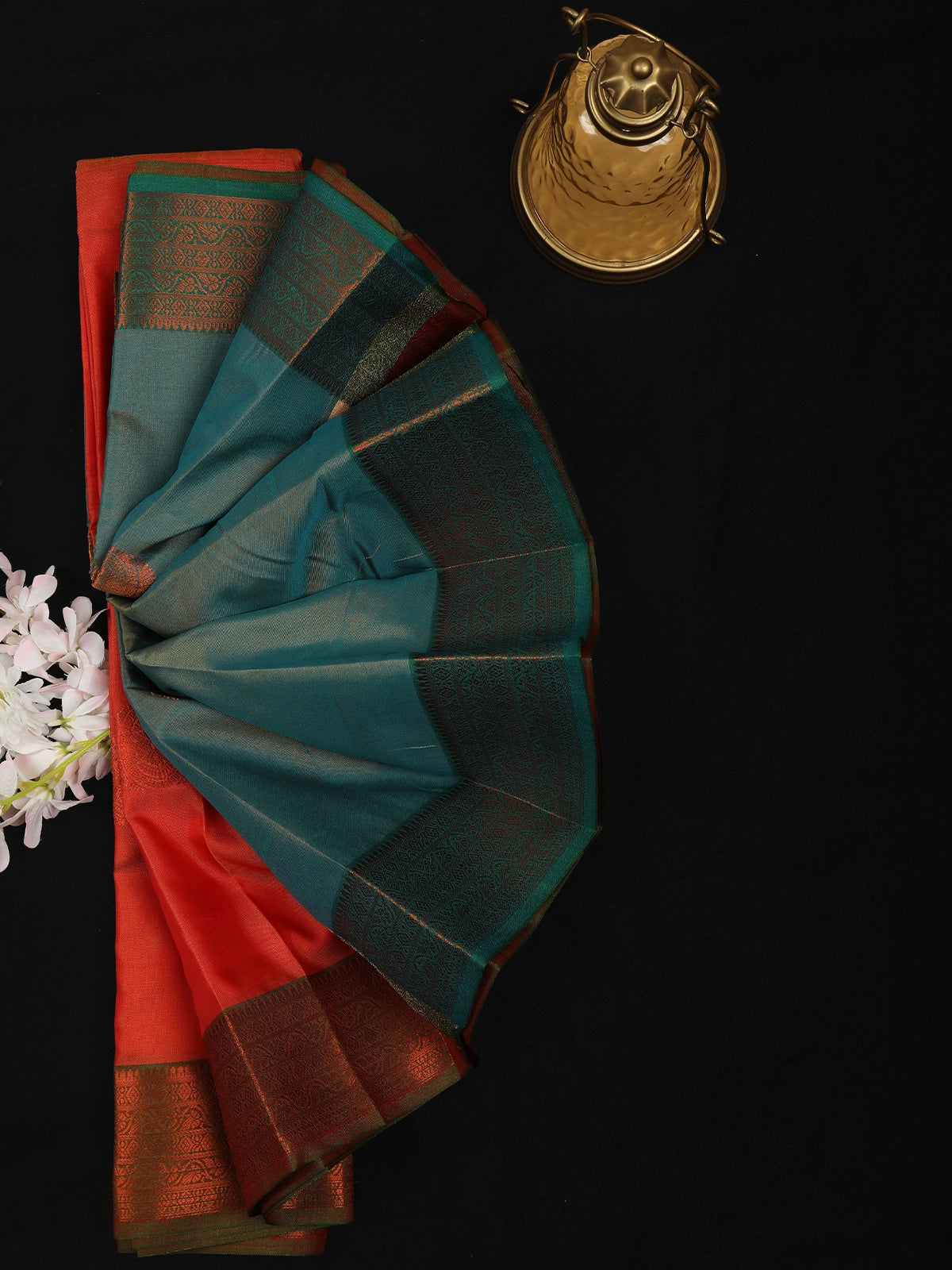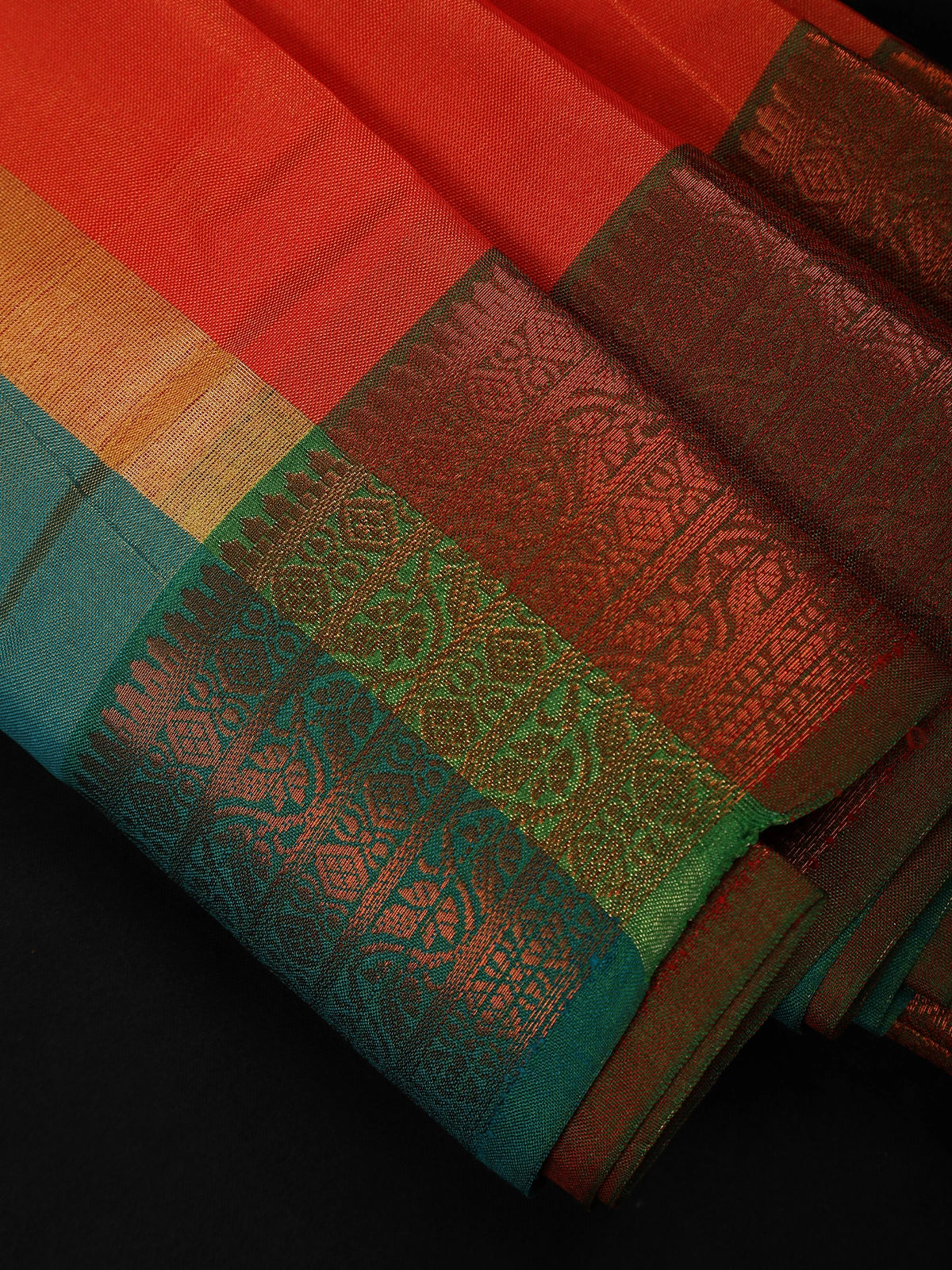 The contrast green border is intricately detailed with fine zari weaving, adding depth and a striking finish to the saree. Paired with a complementing pallu and blouse piece, this saree is an ideal choice for festive occasions, traditional ceremonies, weddings, and cultural celebrations. Its timeless colour combination and classic craftsmanship make it a versatile addition to your saree collection.