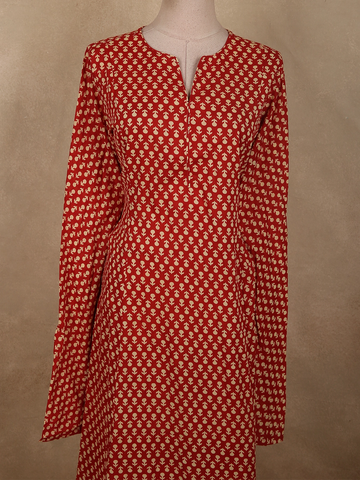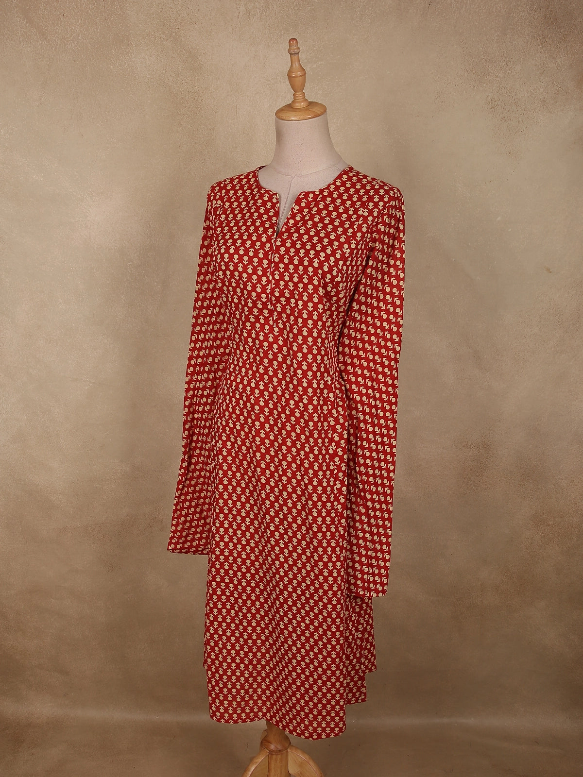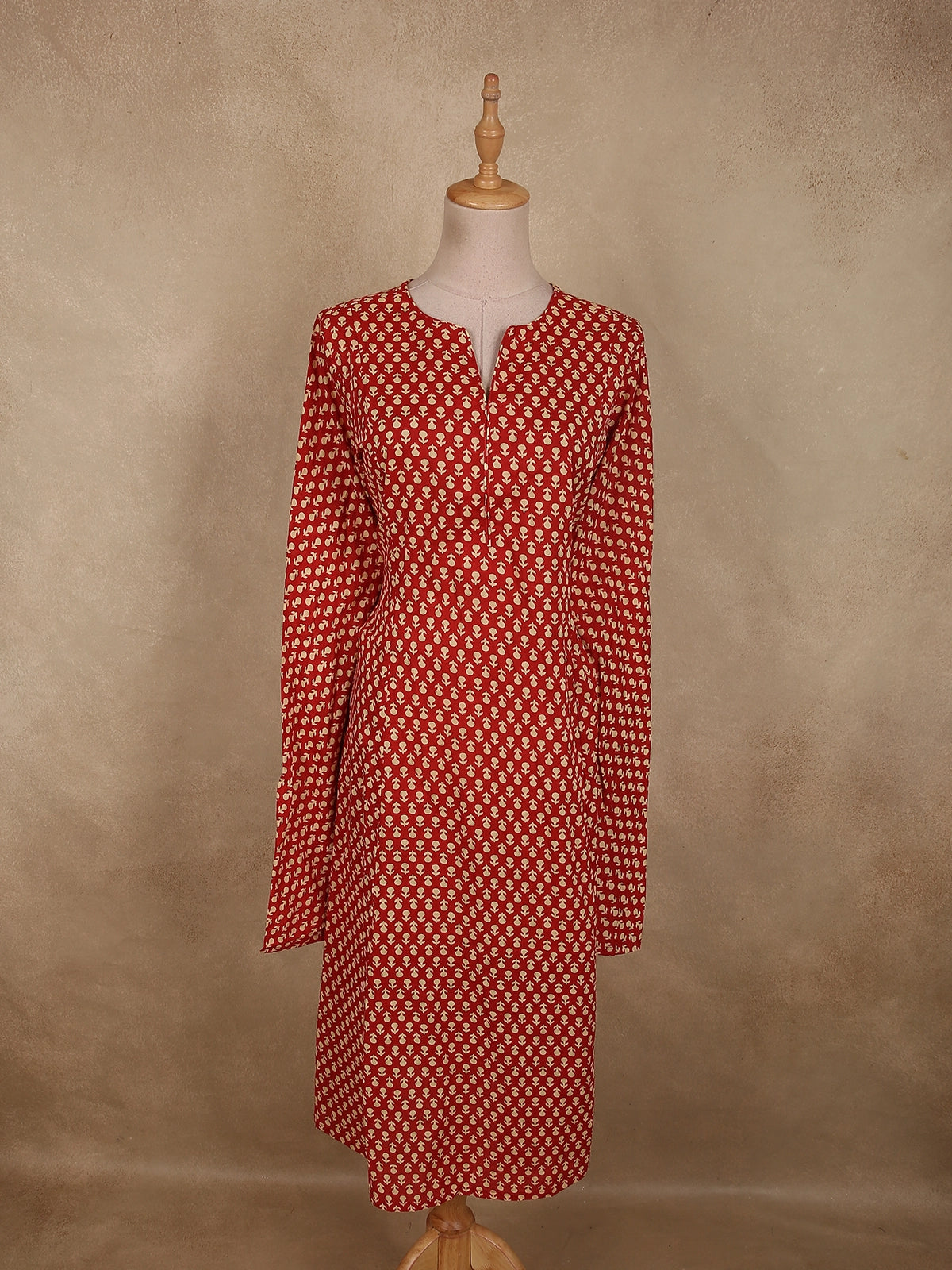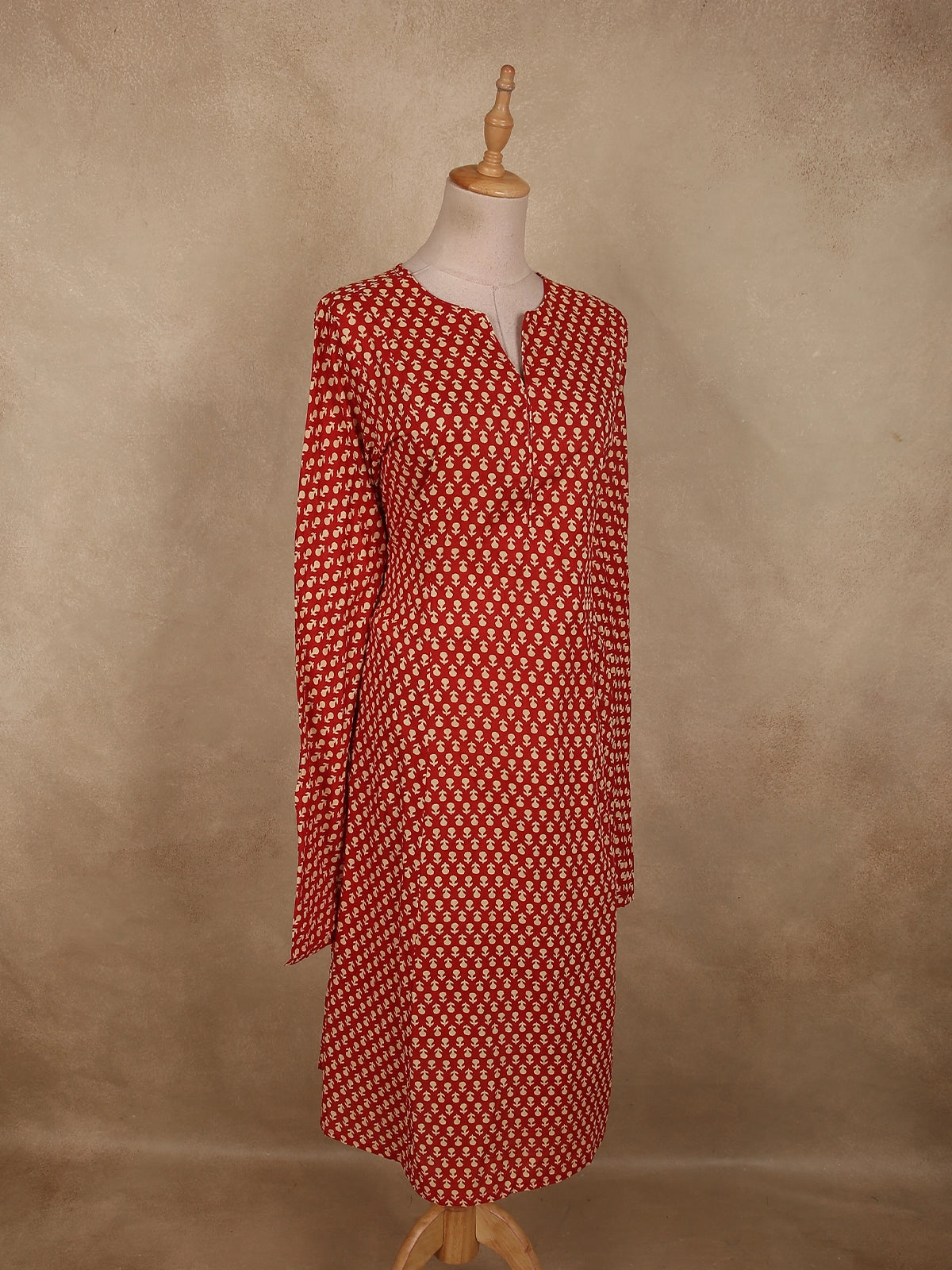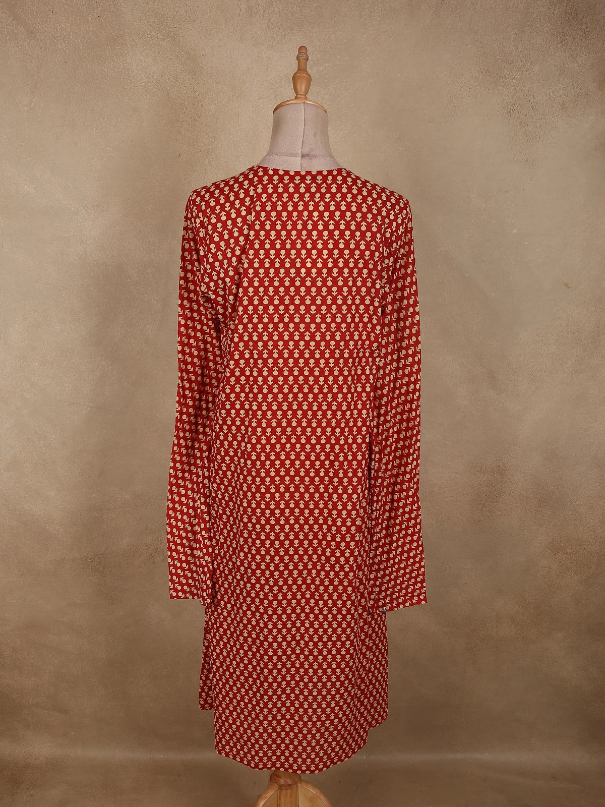 Add a touch of earthy elegance to your everyday wardrobe with this Brick Red Floral Printed Cotton Kurti, designed for comfort and timeless appeal. The rich brick red base offers a warm, grounded tone that beautifully enhances the delicate ivory floral motifs scattered evenly across the fabric.