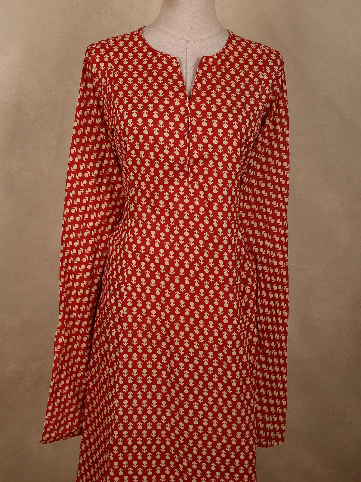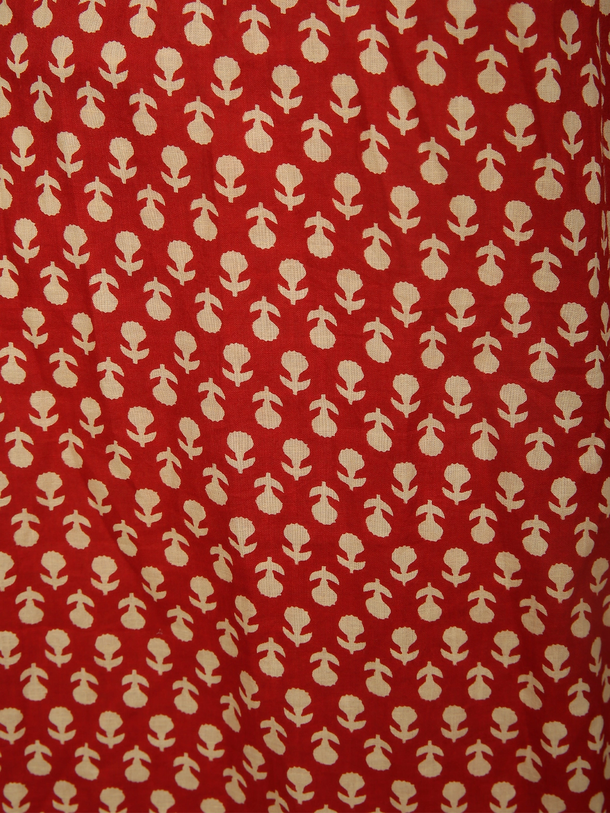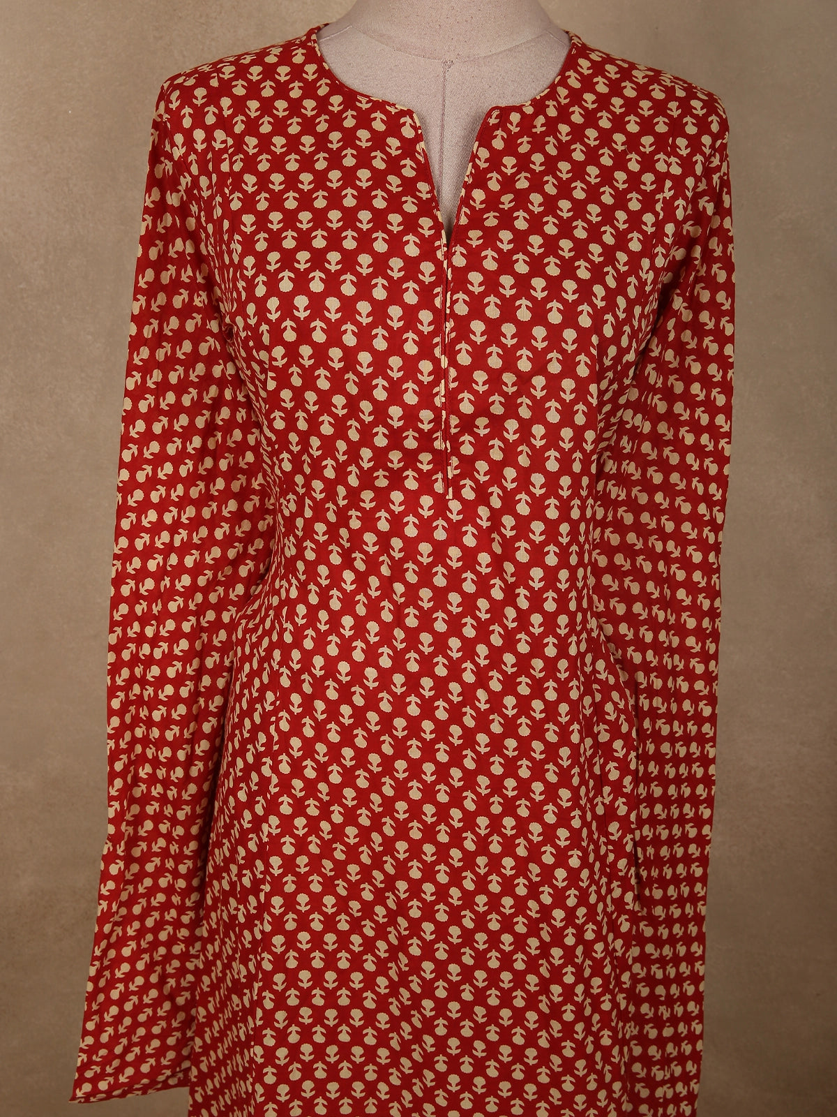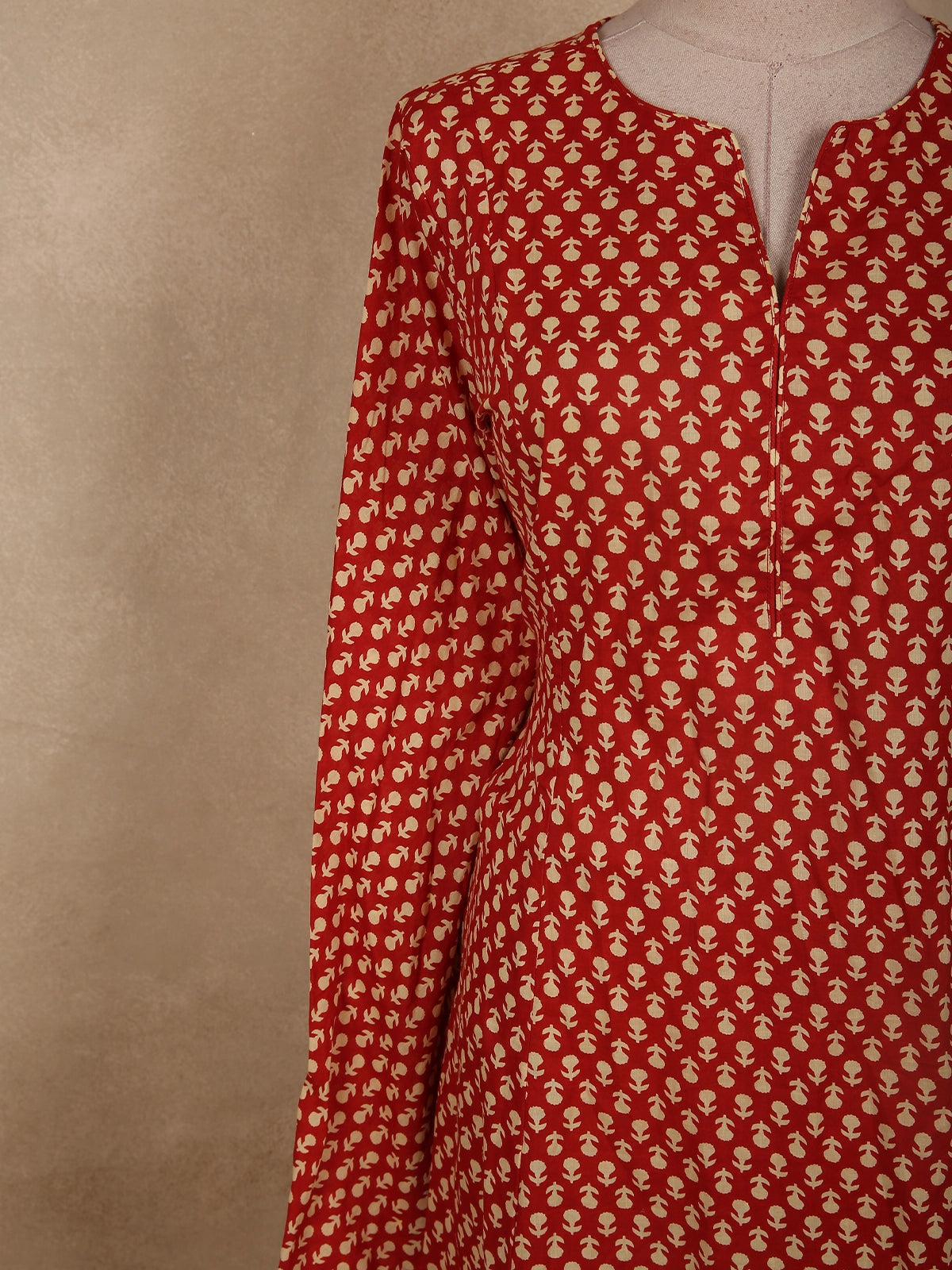 The evenly spaced small floral print creates a clean and sophisticated pattern, giving it a traditional block-print inspired aesthetic. Pair it effortlessly with beige, cream, or black leggings and simple accessories for a polished everyday ethnic look.