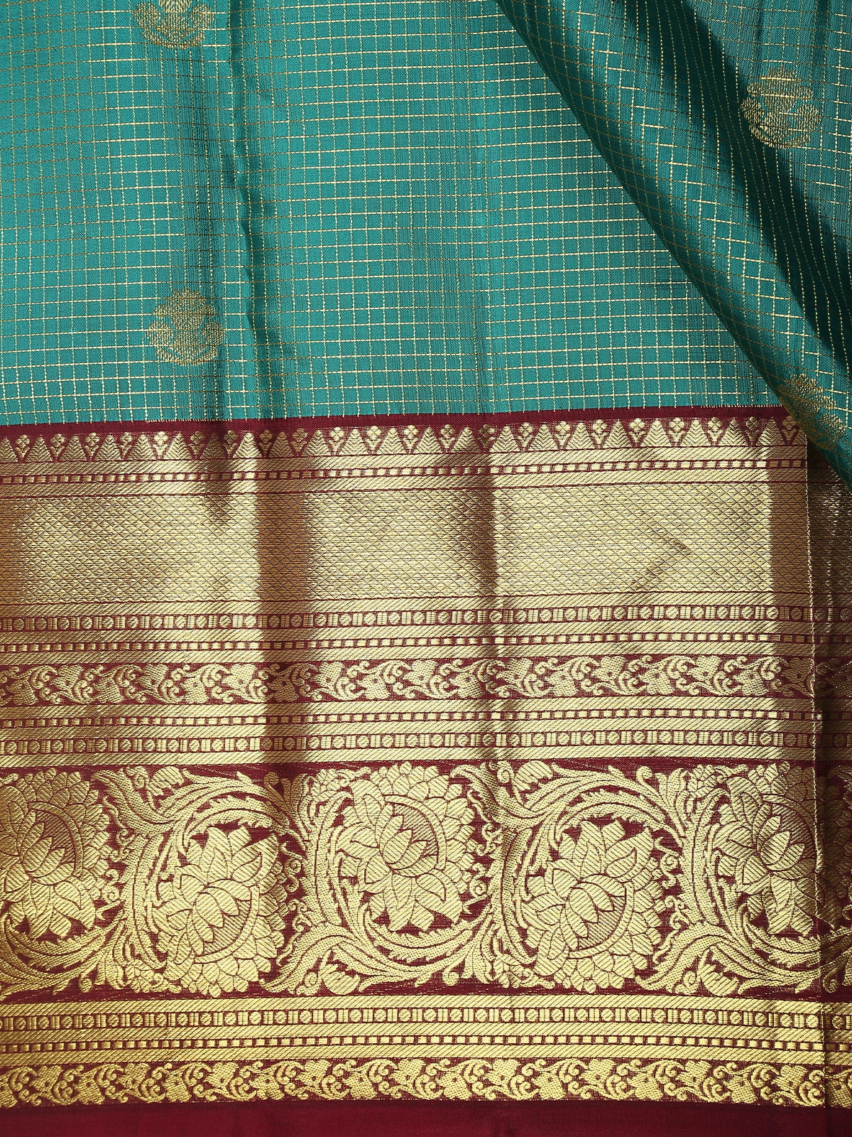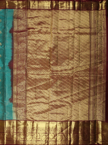 The body of the saree features delicate mini checked zari weaving, intricately crafted to create a subtle geometric texture across the silk. Enhancing the beauty of the checks are elegant zari butta motifs scattered across the body, adding a touch of richness while maintaining a refined and balanced design.
