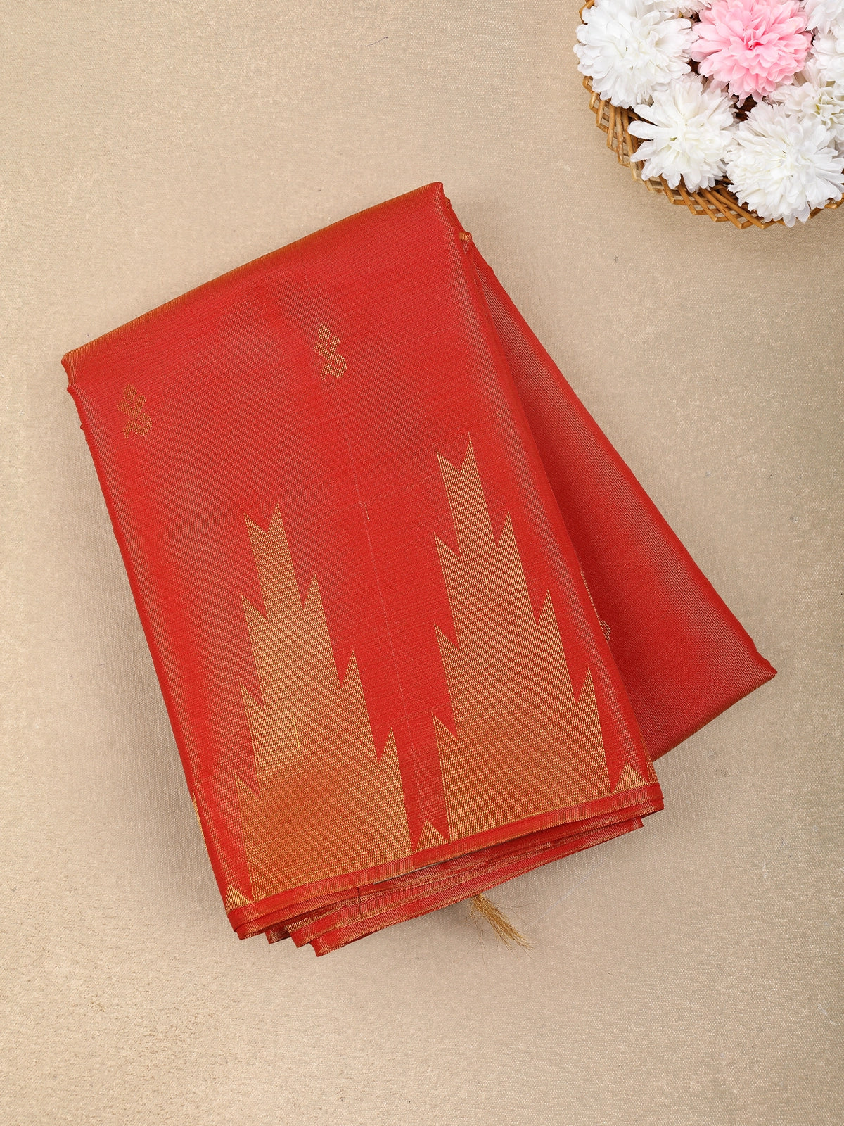 Radiate timeless elegance with this Bright Orange Tissue Saree, beautifully enhanced with gold zari woven temple motifs that reflect classic South Indian craftsmanship. The luminous tissue fabric lends a graceful sheen, making the saree light, airy, and effortlessly elegant to drape.