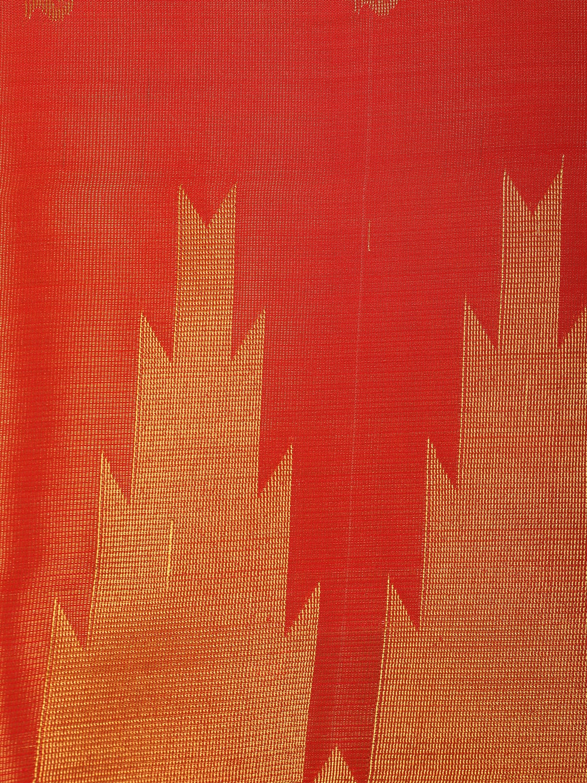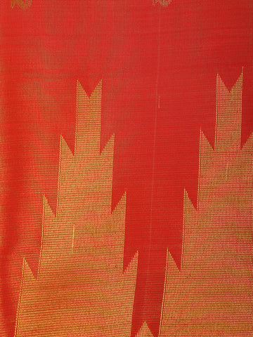 The highlight of this saree is its striking temple-style gold zari border, woven with precision to create a regal silhouette inspired by traditional architecture. Subtle zari accents across the body add depth and richness without overpowering the vibrant orange base, making it perfect for festive and ceremonial wear.