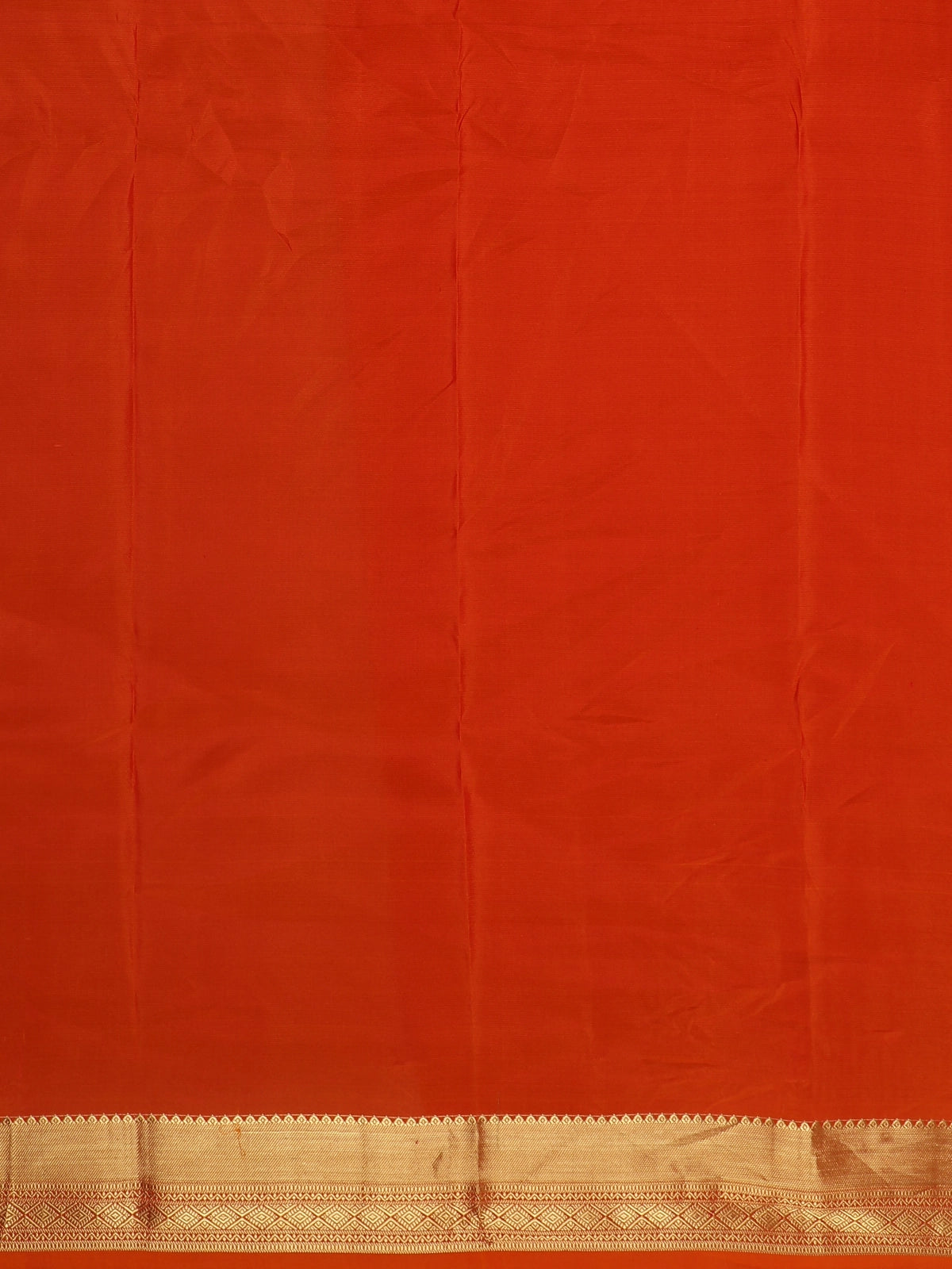 The saree is beautifully highlighted by a bold contrast gold zari border with subtle copper undertones, lending depth and definition to the vibrant red base. The shimmering border frames the saree perfectly, enhancing its ceremonial charm while maintaining a balanced and regal aesthetic.