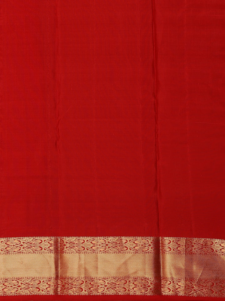 The matching red blouse and pallu complete the ensemble with a cohesive charm, while the ornately designed zari border adds a majestic touch, framing the saree with regal sophistication. With its rich sheen, grand drape, and impeccable weaving, this Kanchipuram masterpiece is the perfect choice for weddings, festive occasions, or temple celebrations.