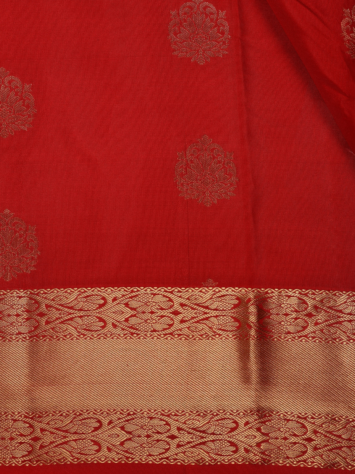 Drape yourself in divine elegance with this Bright Red Butta Woven Pure Kanchipuram Silk Saree, a timeless expression of South Indian craftsmanship. Woven from the finest pure mulberry silk, the saree features intricate gold zari buttas that glisten beautifully across its radiant red body — a true celebration of tradition and luxury.