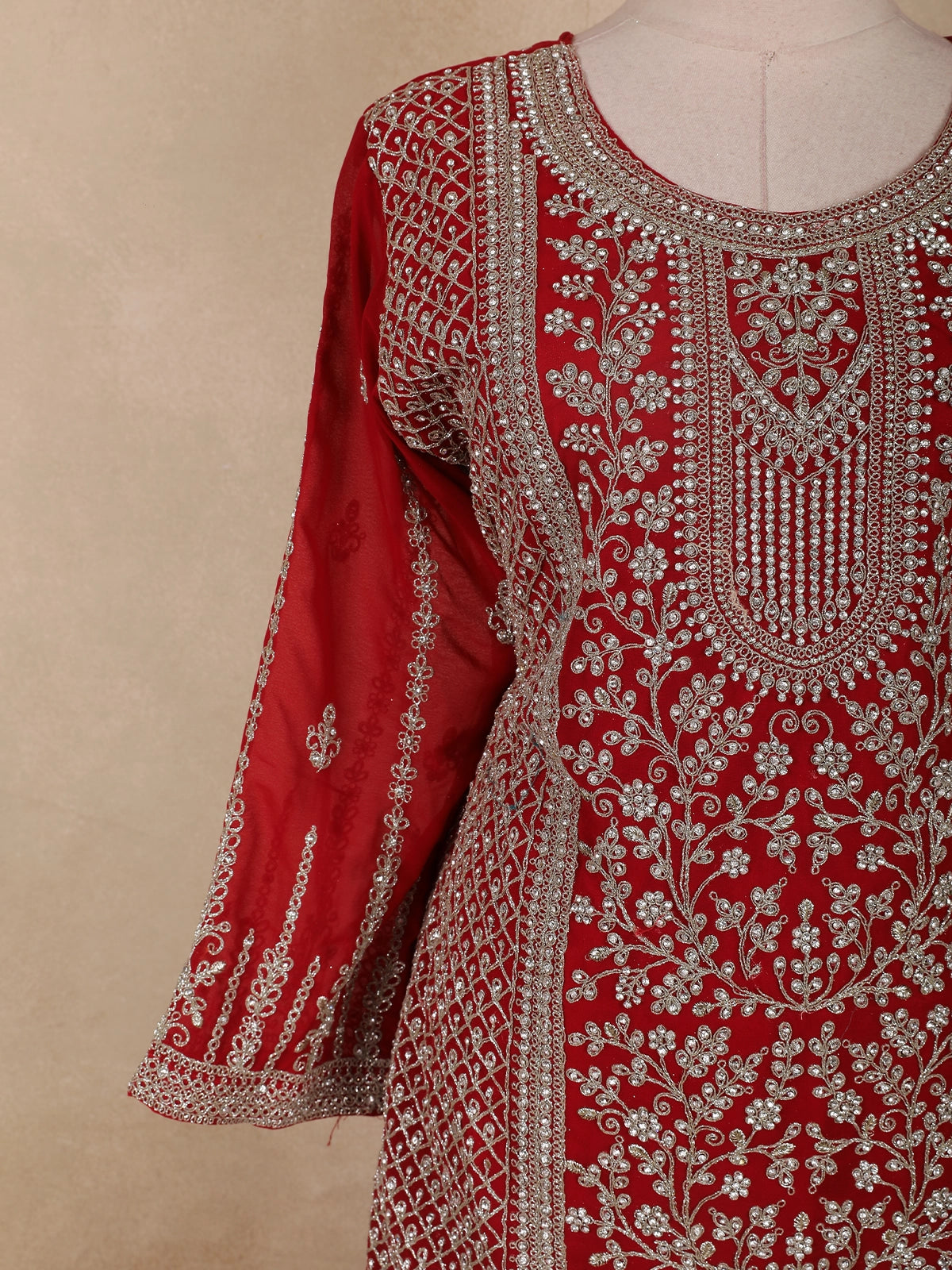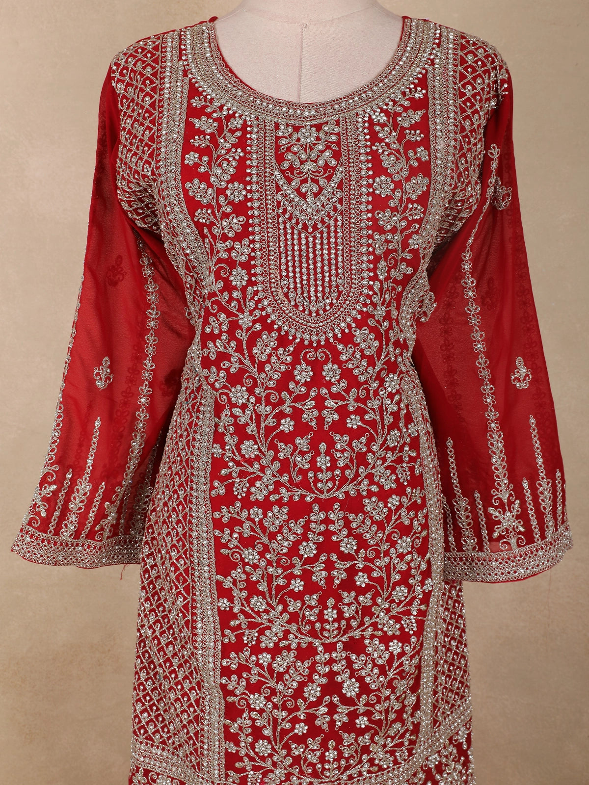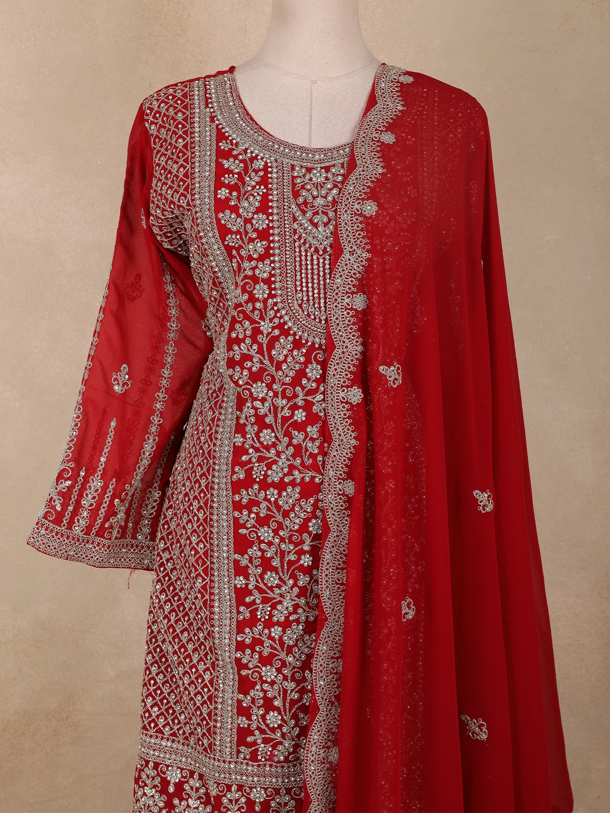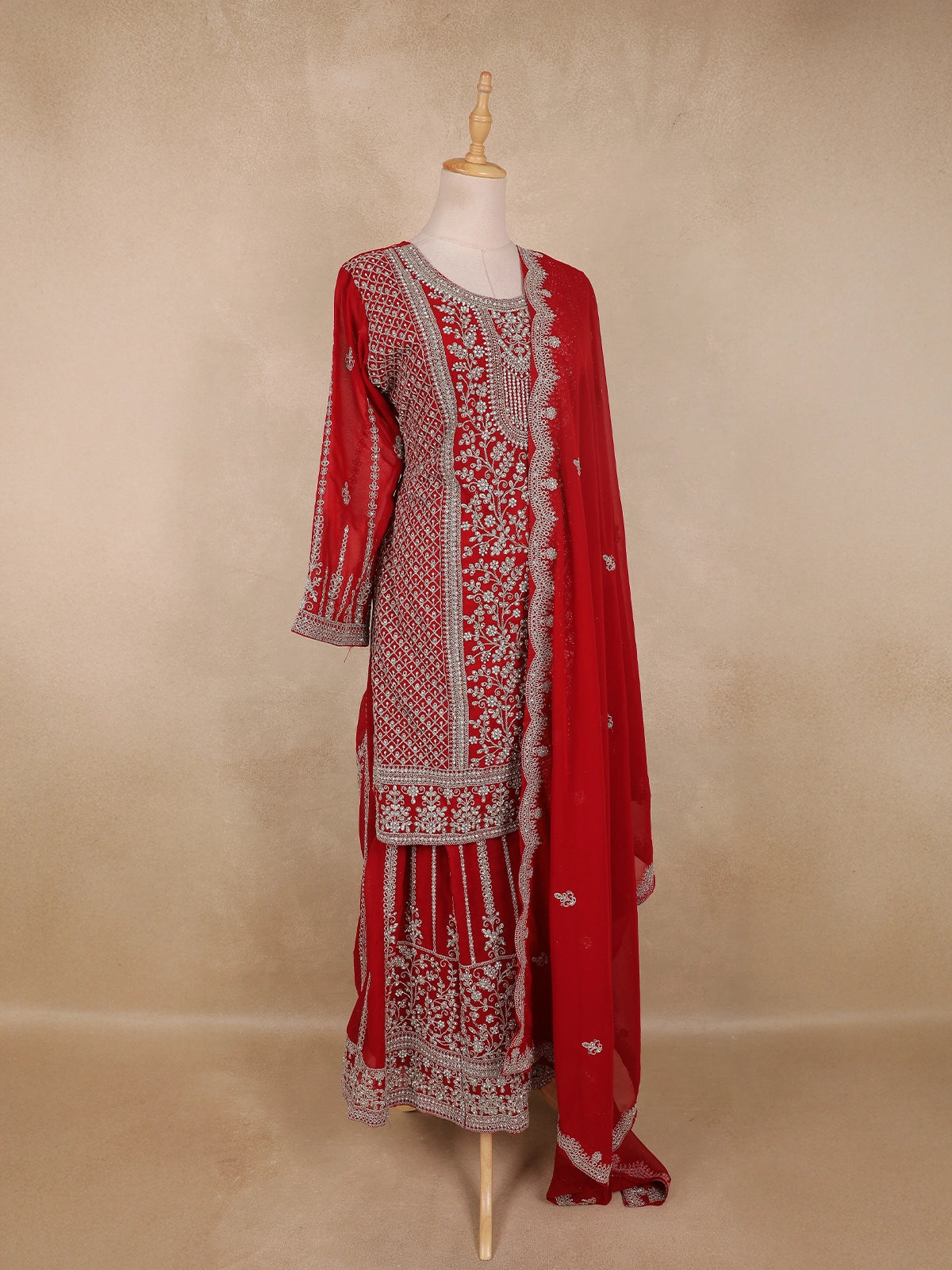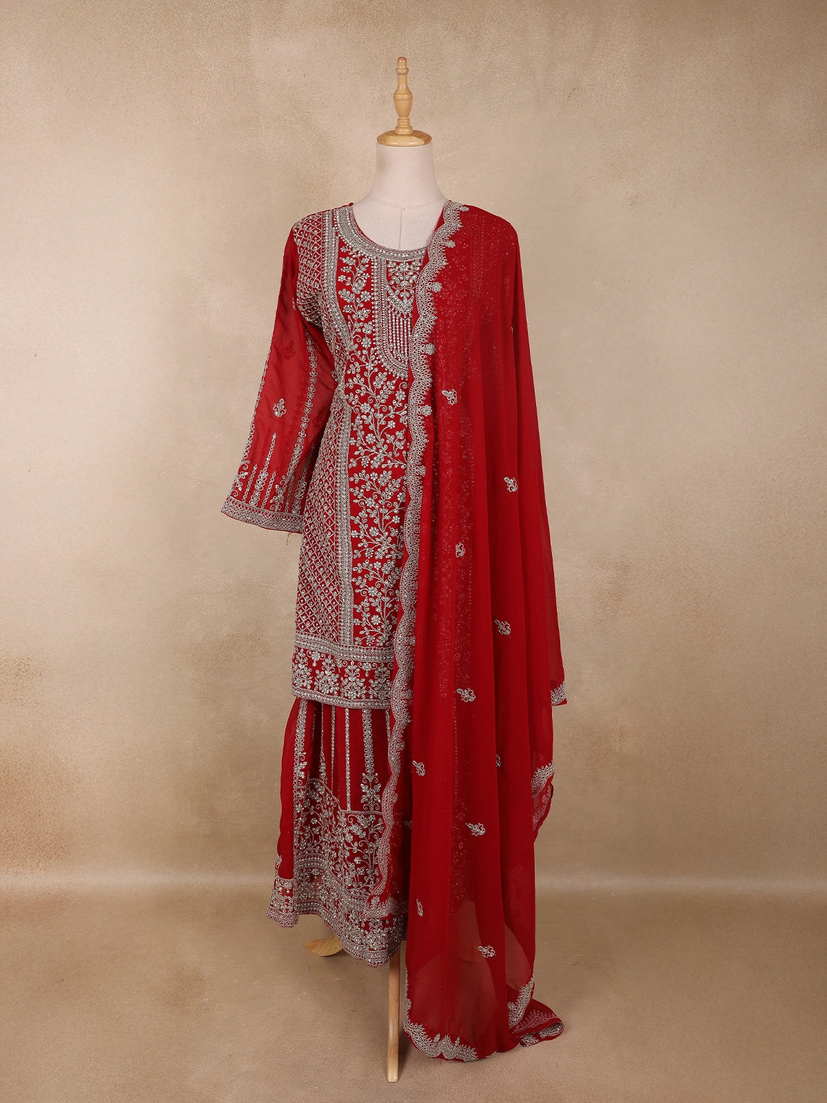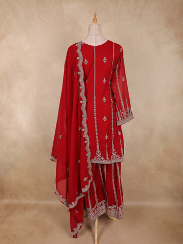 Bright Red Floral Embroidered Design Georgette Palazzo Suit with Dupatta