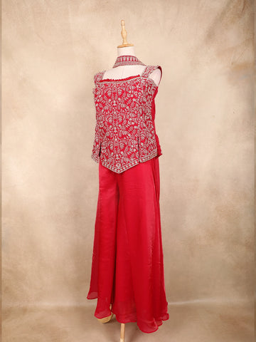 Ideal for wedding celebrations, festive parties, or formal gatherings, this red organza palazzo suit reflects sophisticated craftsmanship and feminine allure, making it a timeless statement piece for every elegant wardrobe.