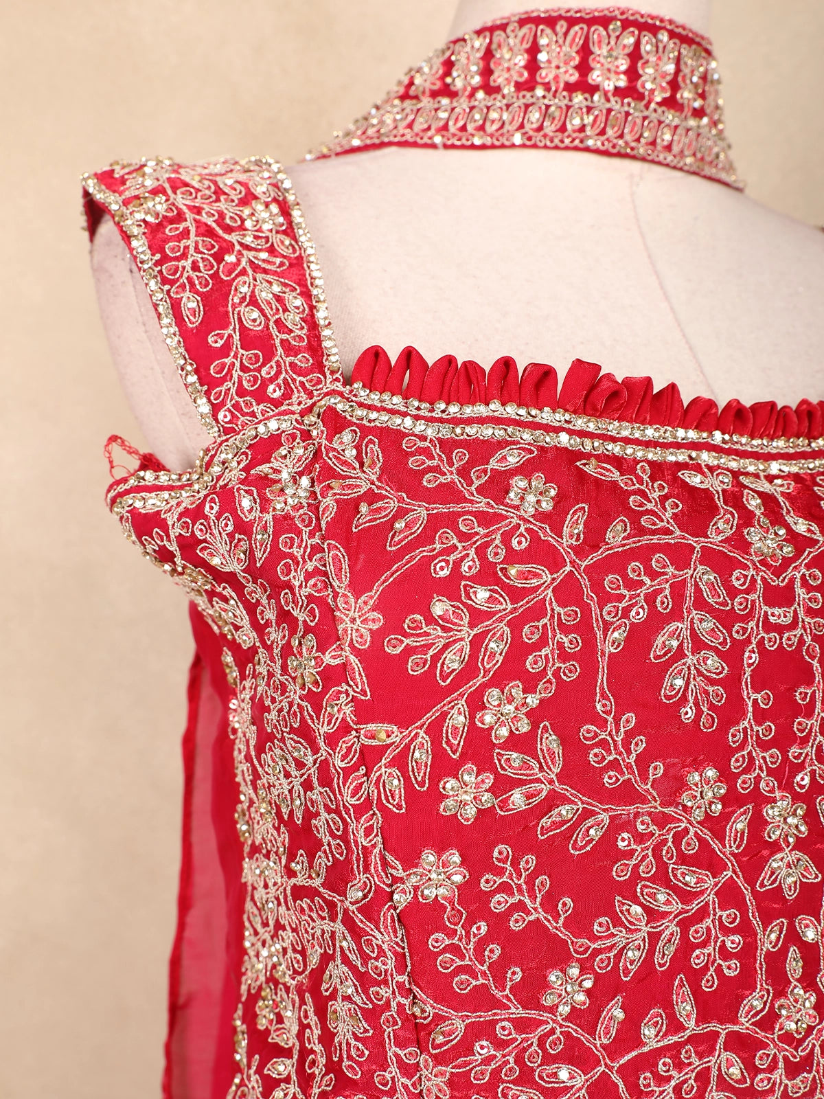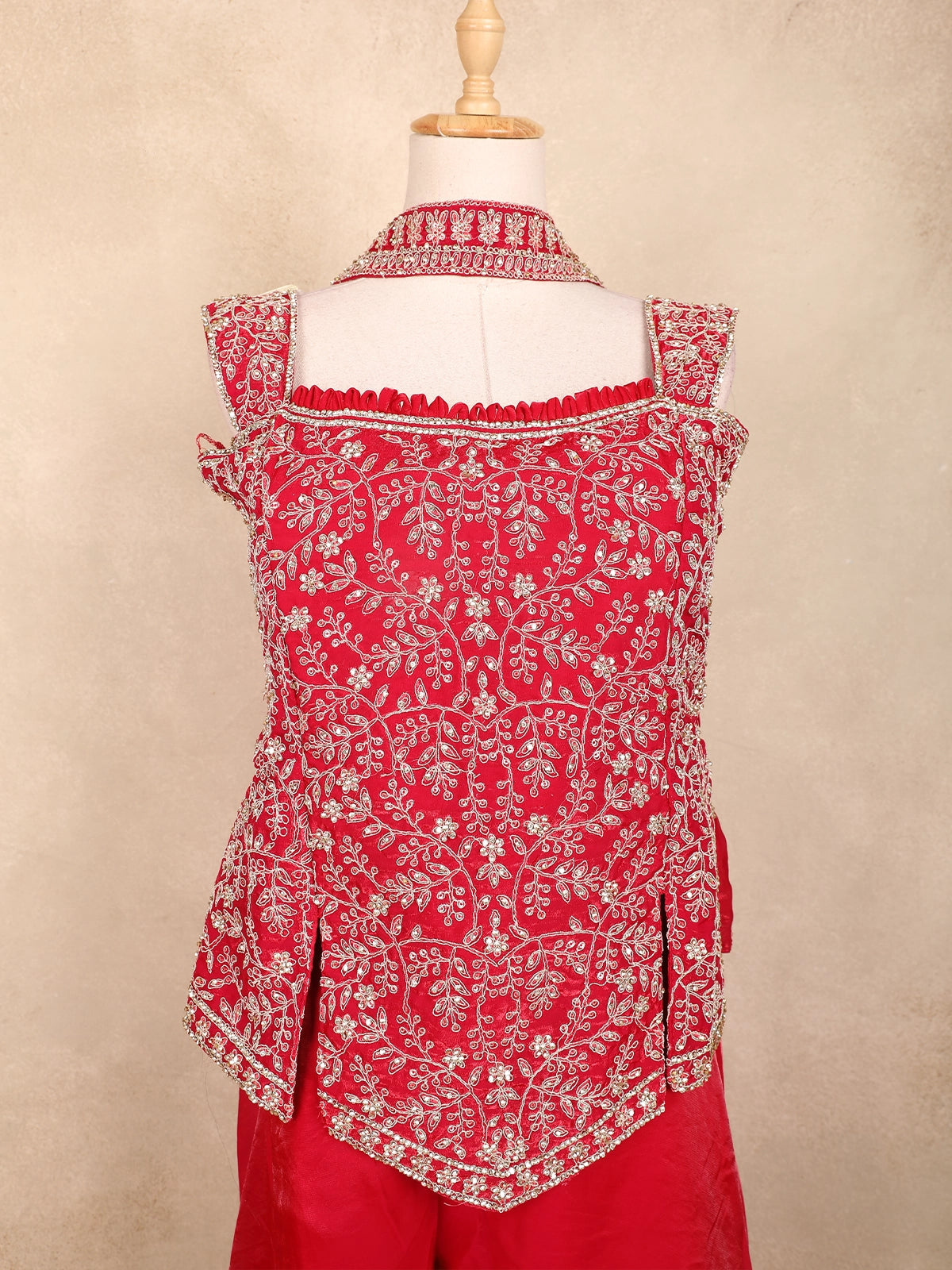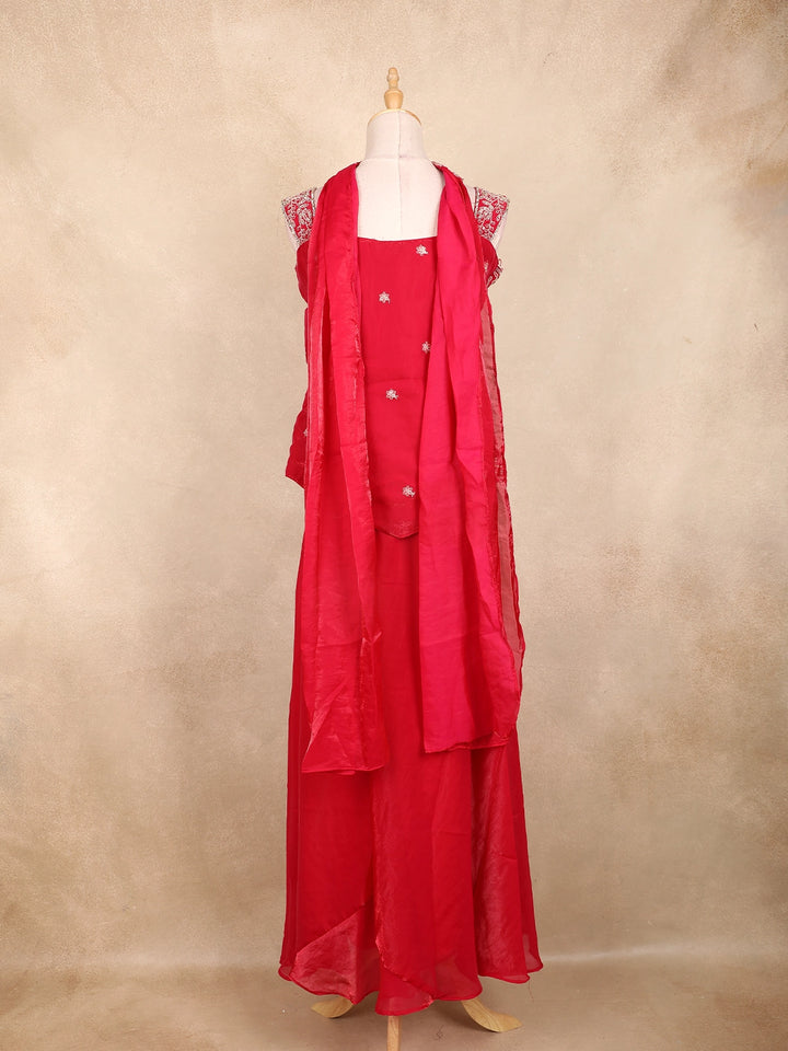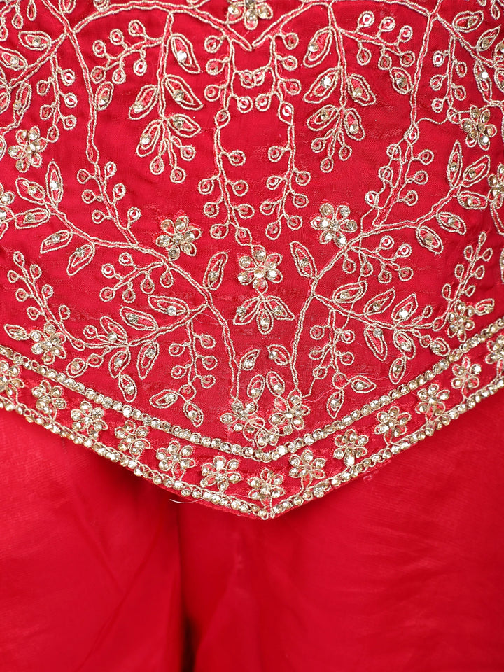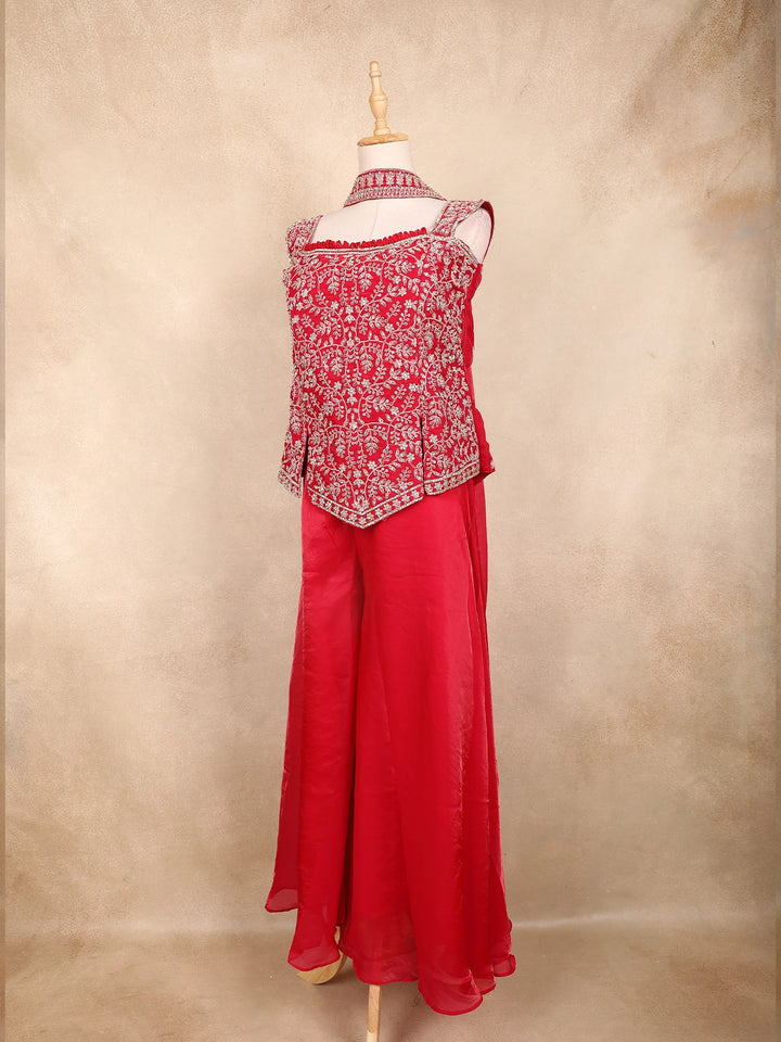 Bright Red Floral Embroidered Design Organza Palazzo Suit