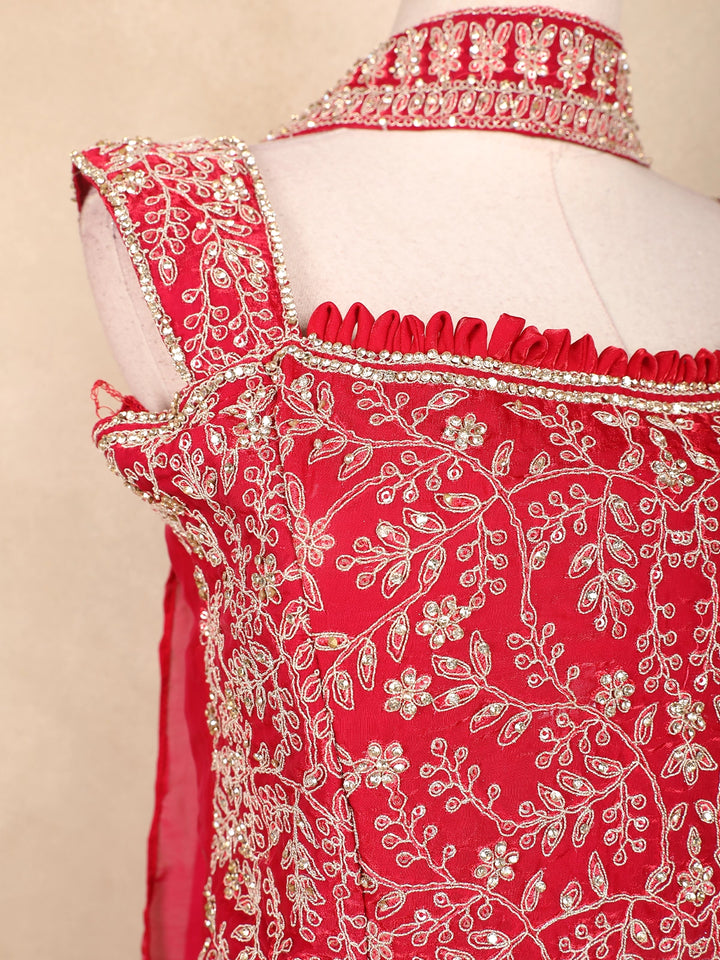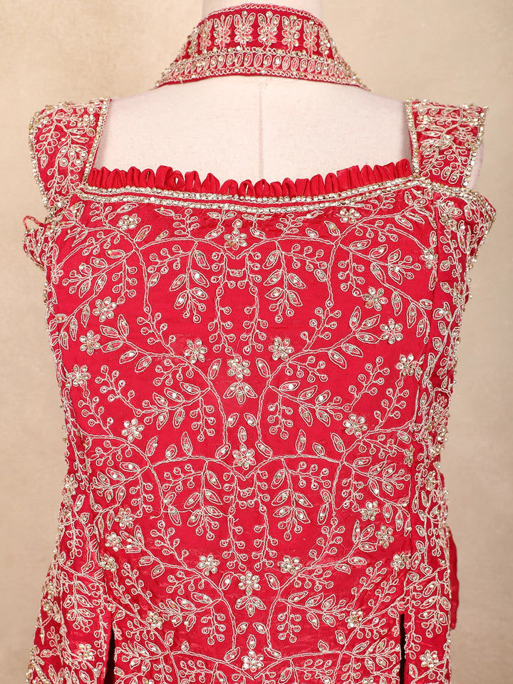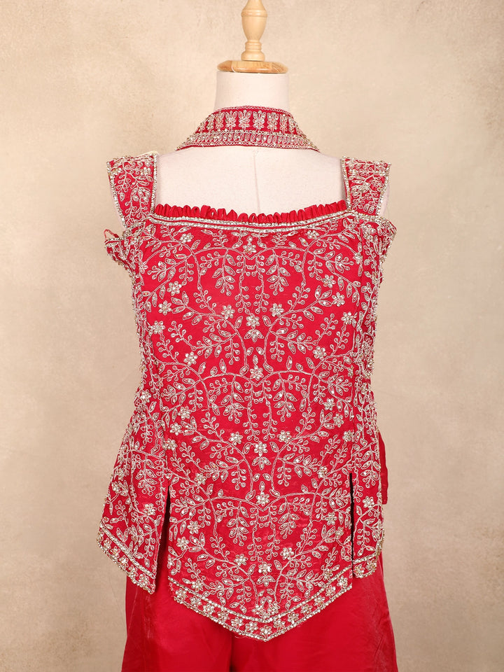 Embrace sheer elegance with this Bright RedĀ Floral Embroidered Organza Palazzo Suit, a captivating ensemble designed to elevate your festive and special-occasion wardrobe. The outfit features a sleeveless square-neck kurta beautifully enriched with floral embroidery, showcasing a meticulous blend of zari, thread, and sequin detailing that adds a touch of regal shimmer to the rich red base.