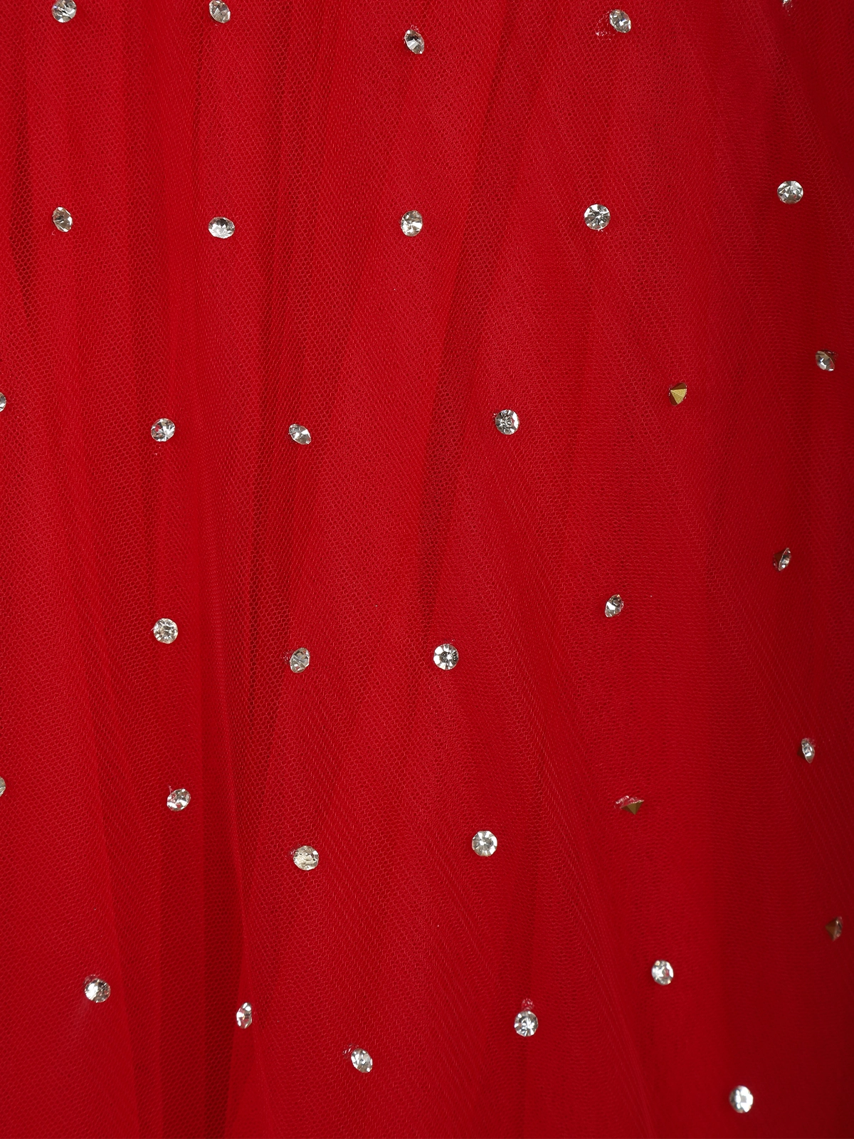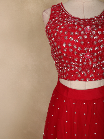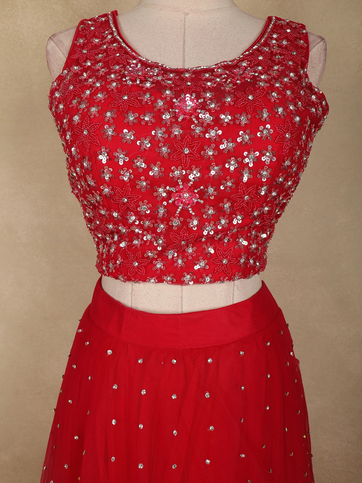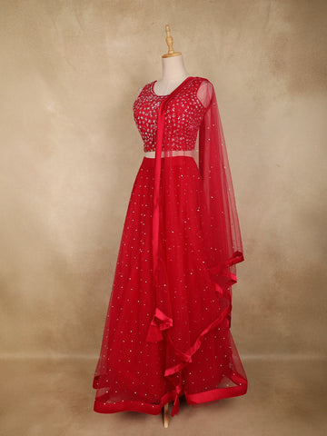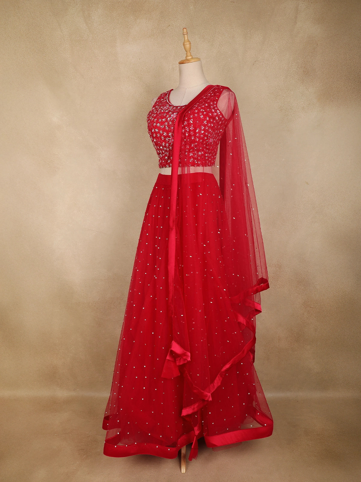 Bright Red Sequins and Beads Embroidered Design Net Lehenga With Net Dupatta