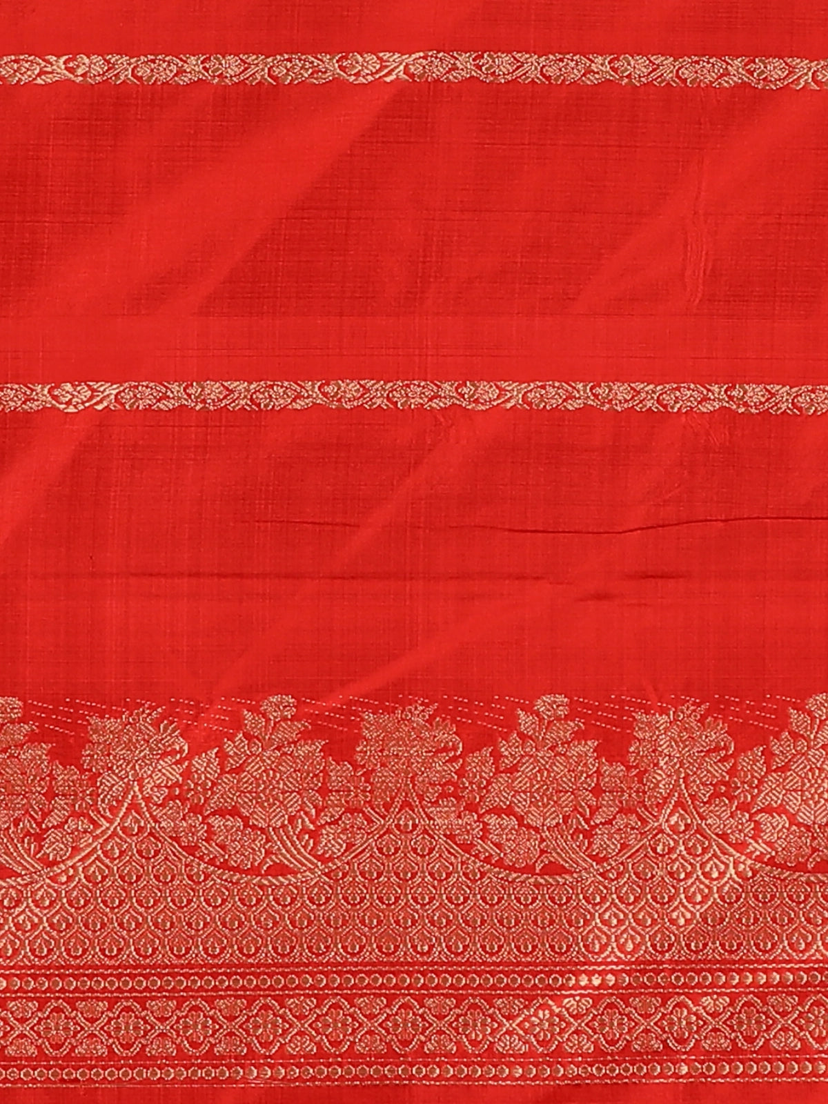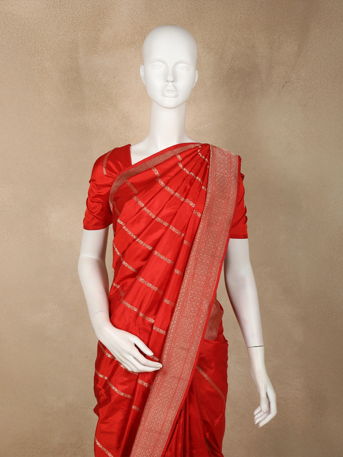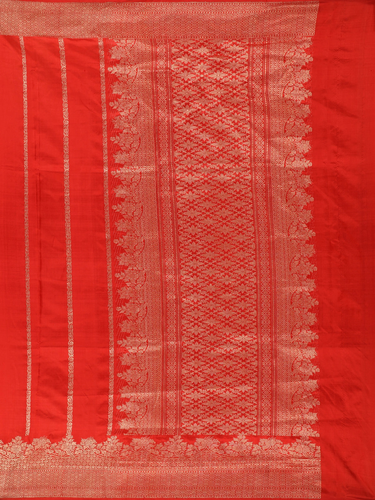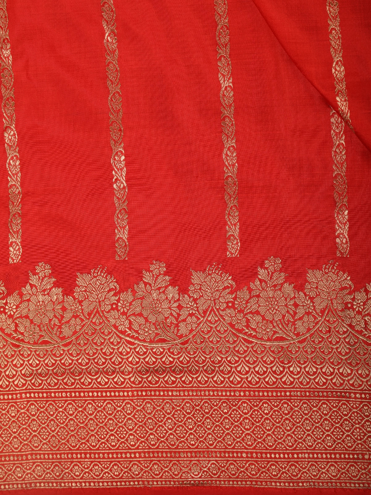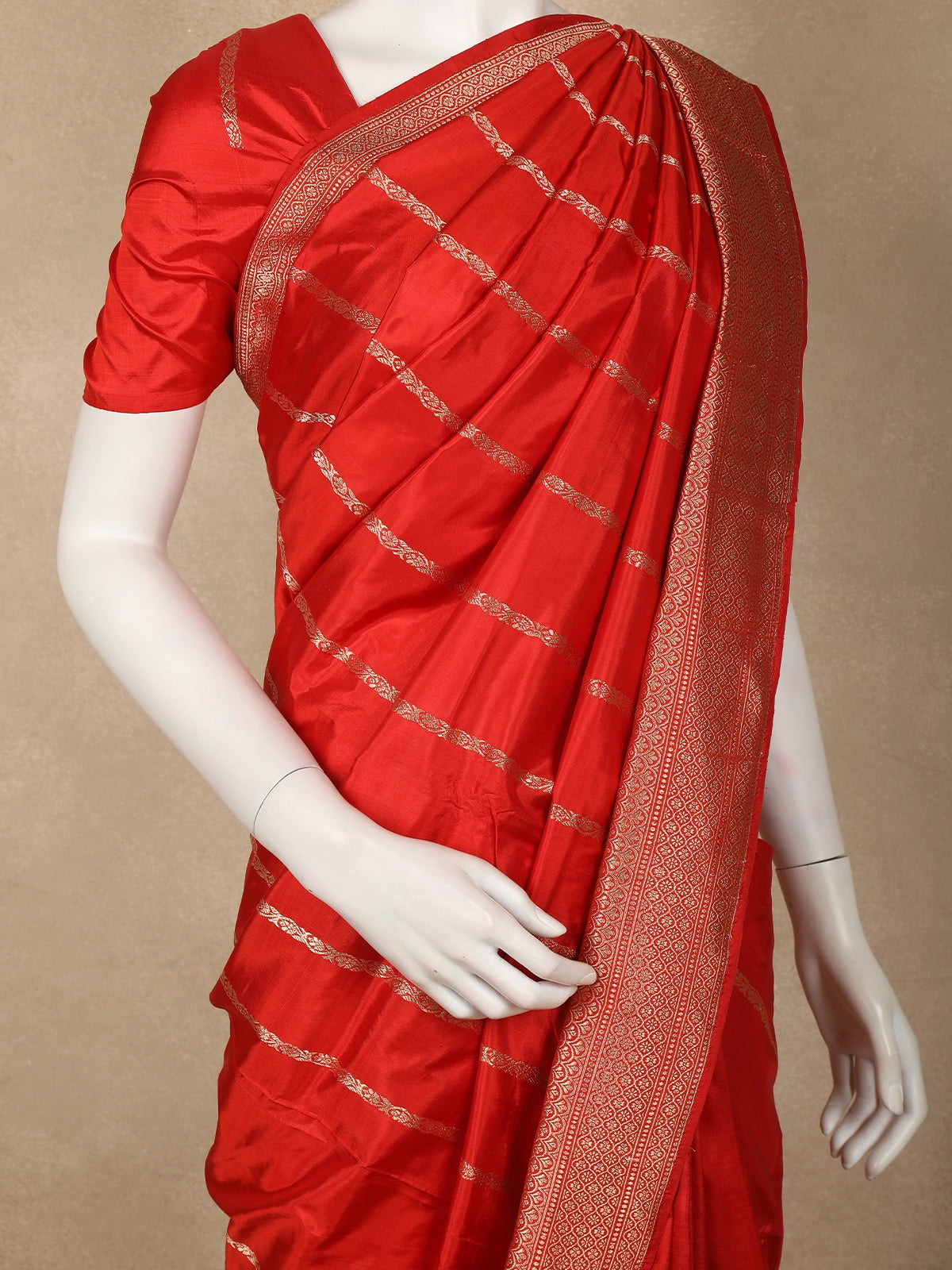 Step into effortless elegance with this stunning bright red Pure Banarasi Saree, crafted to perfection with timeless weaving details. The vibrant red body is enhanced with gold zari striped motifs, arranged in refined horizontal lines that add a graceful rhythm to the drape. The smooth texture and lustrous sheen of pure Banarasi silk elevate its richness, making it a beautiful choice for both traditional and festive occasions.