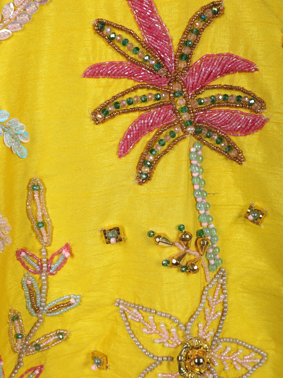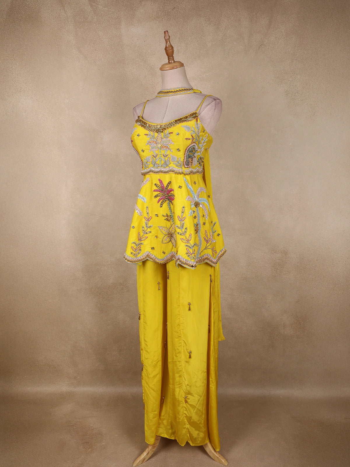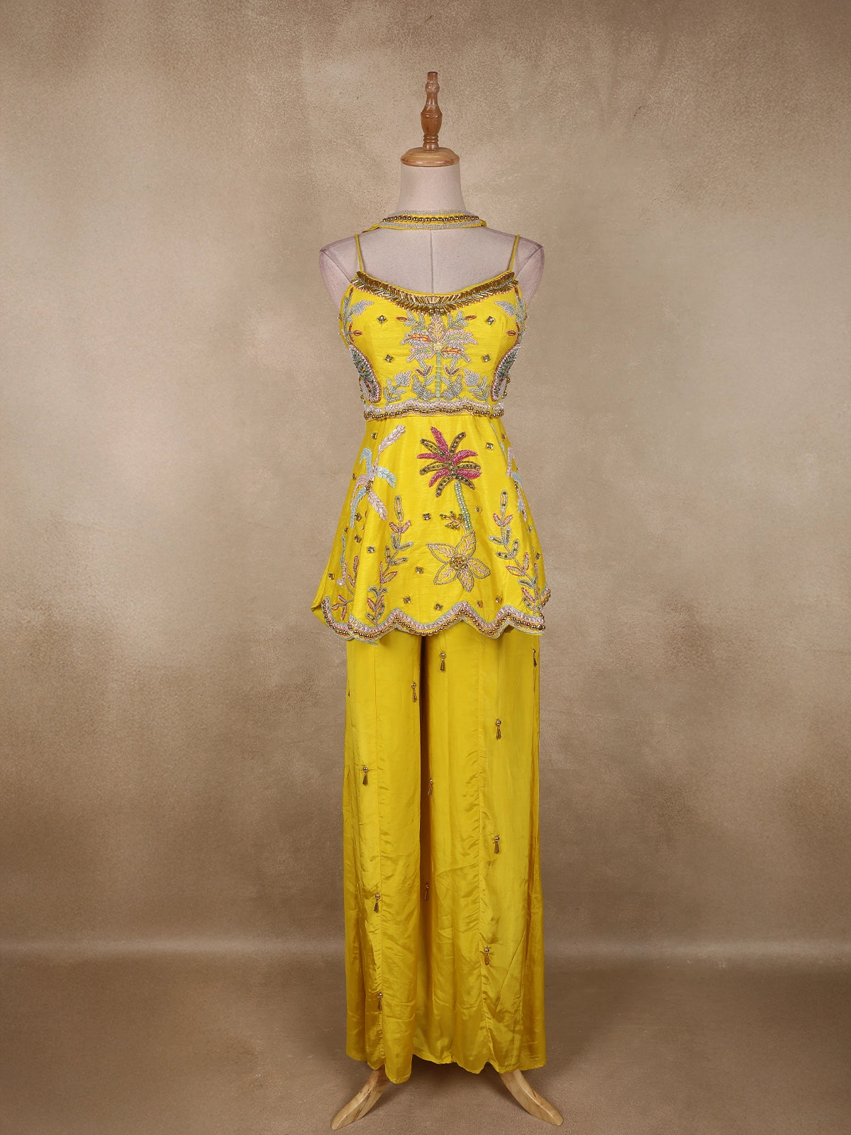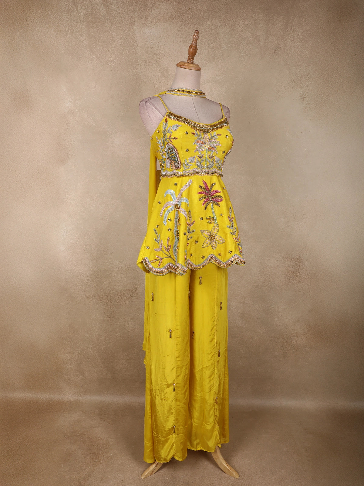 The flowing crepe palazzo is adorned with scattered sequin and bead floral motifs, ensuring a harmonious continuation of the embellished theme. Soft pastel highlights in blush pink, mint green, and aqua blue contrast beautifully against the sunshine yellow base, creating a vibrant yet balanced aesthetic.