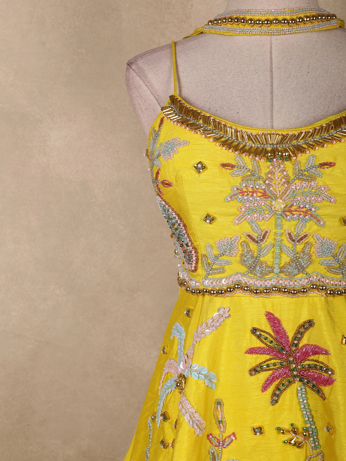 The bodice features intricate hand-embroidered sequins, beads, crystals, and fine thread work, arranged in elegant floral motifs that add depth and sparkle. A striking gold-toned bugle bead–embellished neckline elevates the design with a touch of contemporary glamour, while the delicate spaghetti straps lend a refined, modern silhouette. The waistline is accentuated with gold bead edging, giving the ensemble a structured yet feminine finish.