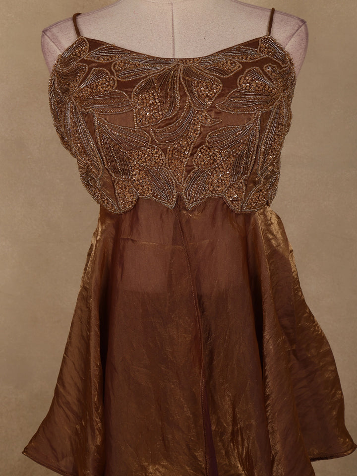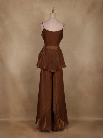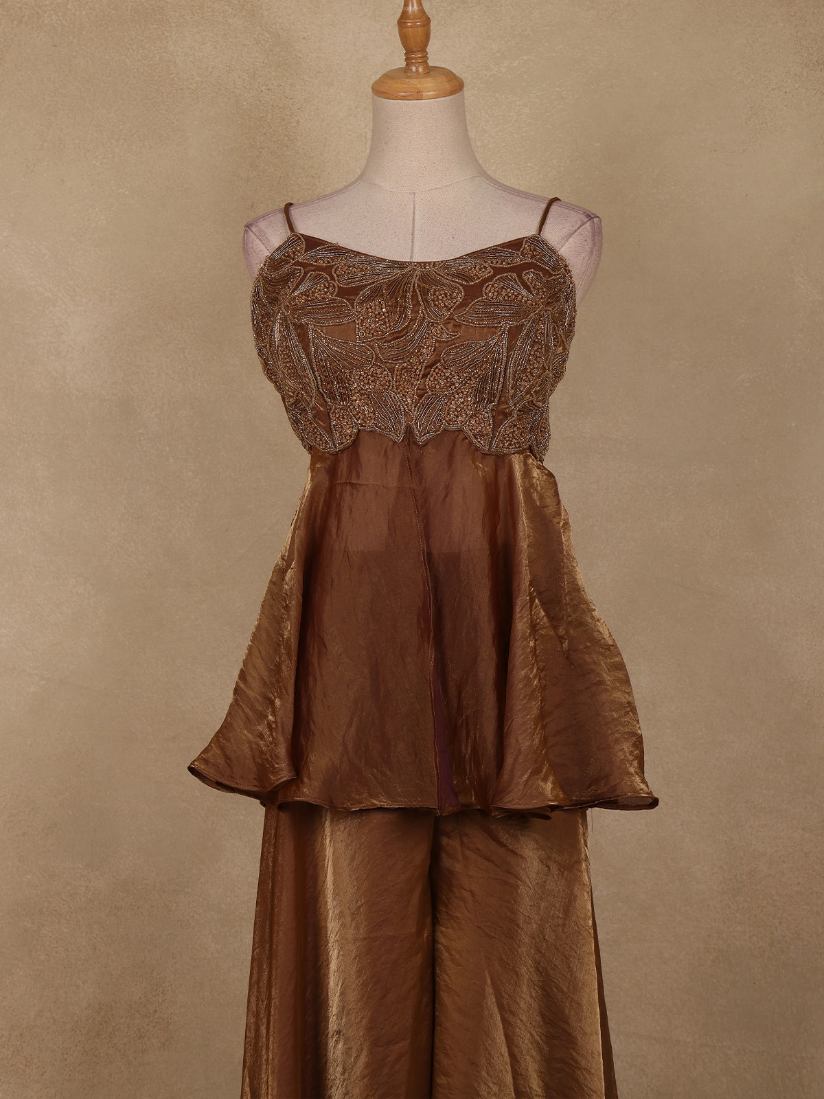Exude contemporary sophistication in this bronze brown ensemble that beautifully blends shimmer and structure. The outfit features a delicately beaded embroidered Space Silk peplum top, adorned with intricate floral motifs and sequins that shimmer under the light. Designed with thin shoulder straps and a flattering sweetheart neckline, the top creates a refined and modern silhouette.
