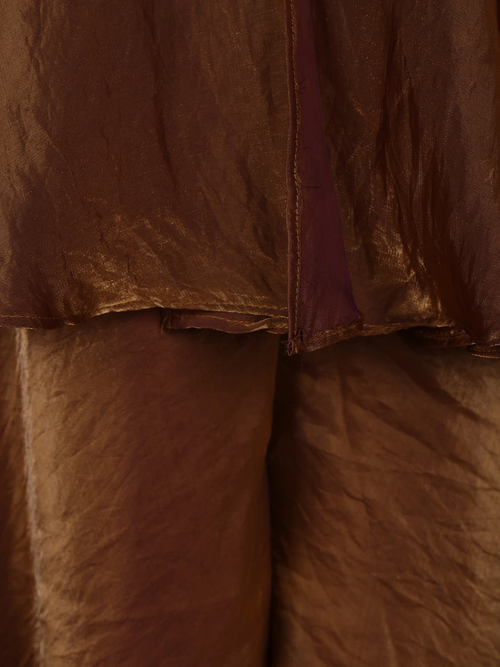 The flowy flared palazzo pants, crafted in glossy bronze-hued fabric, complement the top with an effortless drape and graceful fall — adding a touch of understated luxury.