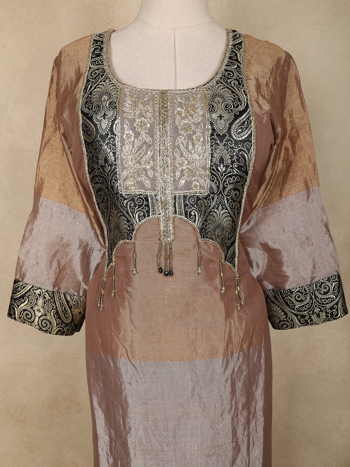 Make a bold yet graceful entry at any celebration with this exquisite brown and black tissue silk salwar suit. The kurta showcases a floral brocade yoke embellished with shimmering zari embroidery and elegant tassels, adding a refined designer touch. Its subtle patch-style layout and rich sheen enhance the premium appeal of tissue silk.