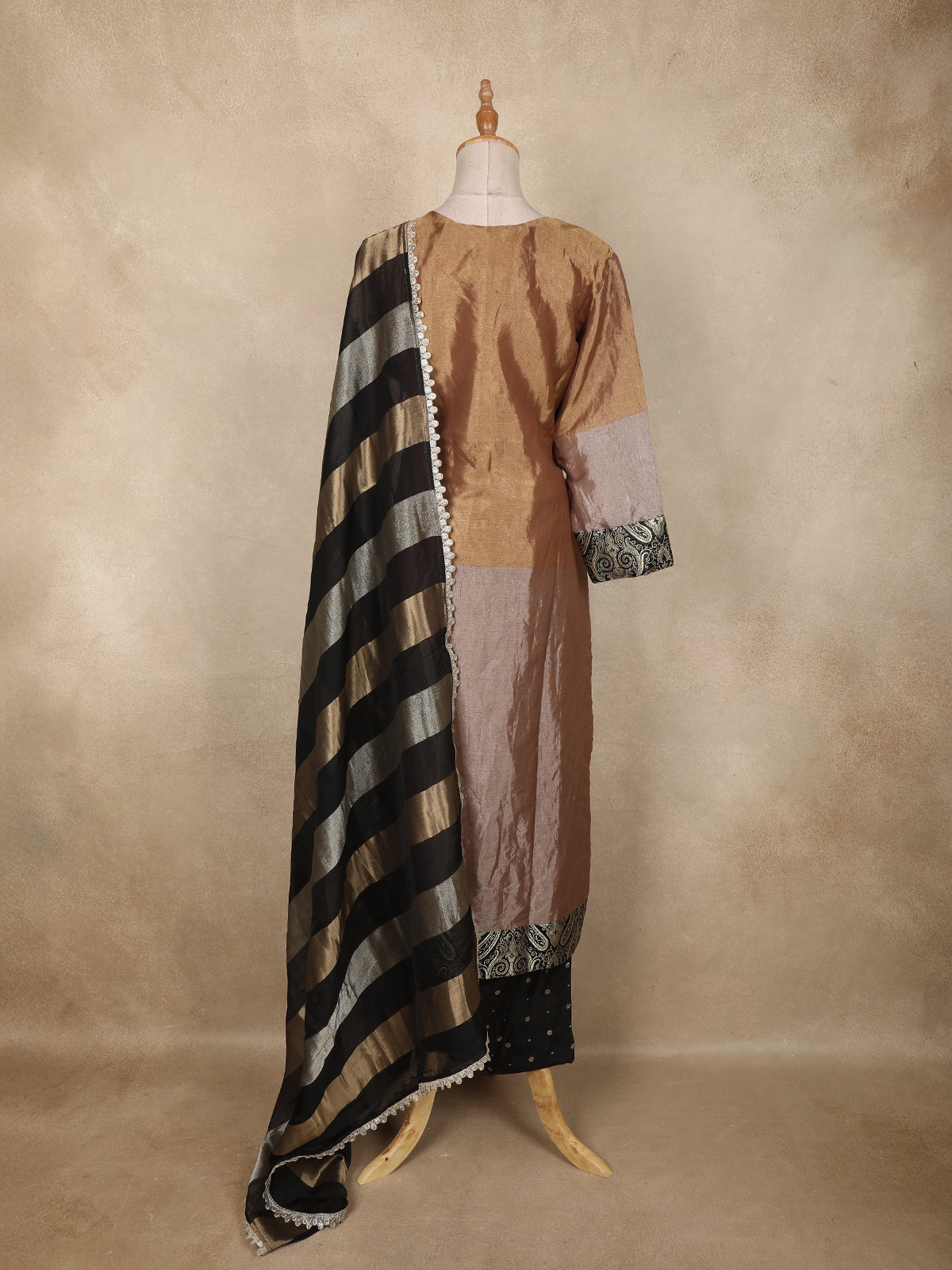 Brown and Black Floral Design Tissue Silk Salwar Suit with Striped Dupatta