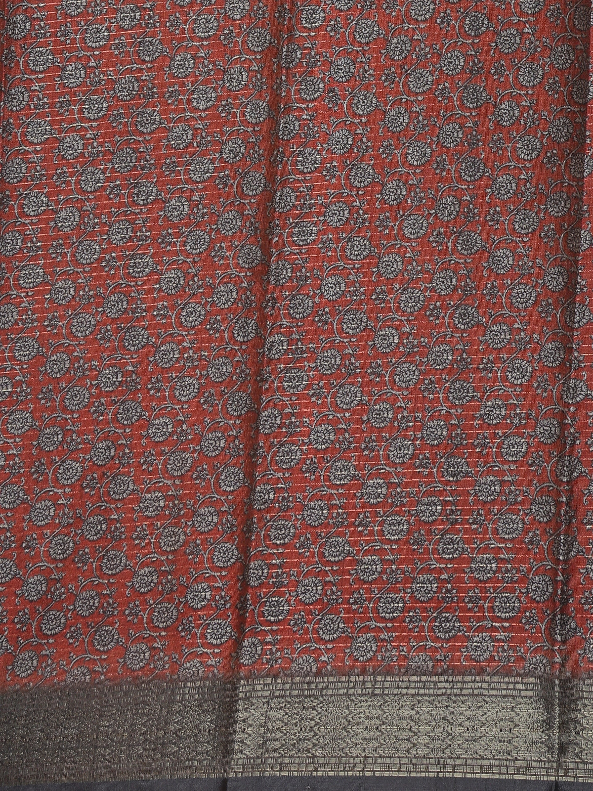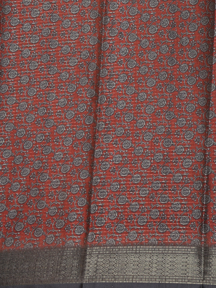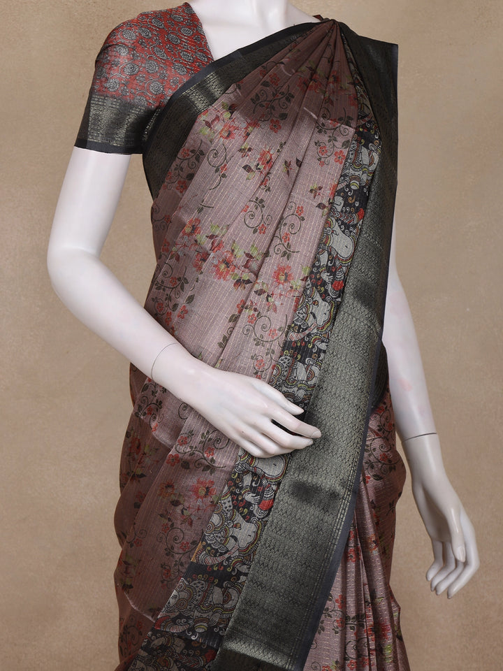 Exuding refined elegance, this Brown and Black Floral Woven Mixed Cotton Fancy Saree is a graceful fusion of classic artistry and modern sophistication. The saree showcases a rich woven floral design intricately detailed across a muted brown body, while the deep black zari border and pallu bring out its regal allure. The contrast of earthy and dark tones lends this drape a timeless appeal, making it suitable for both festive and formal occasions.