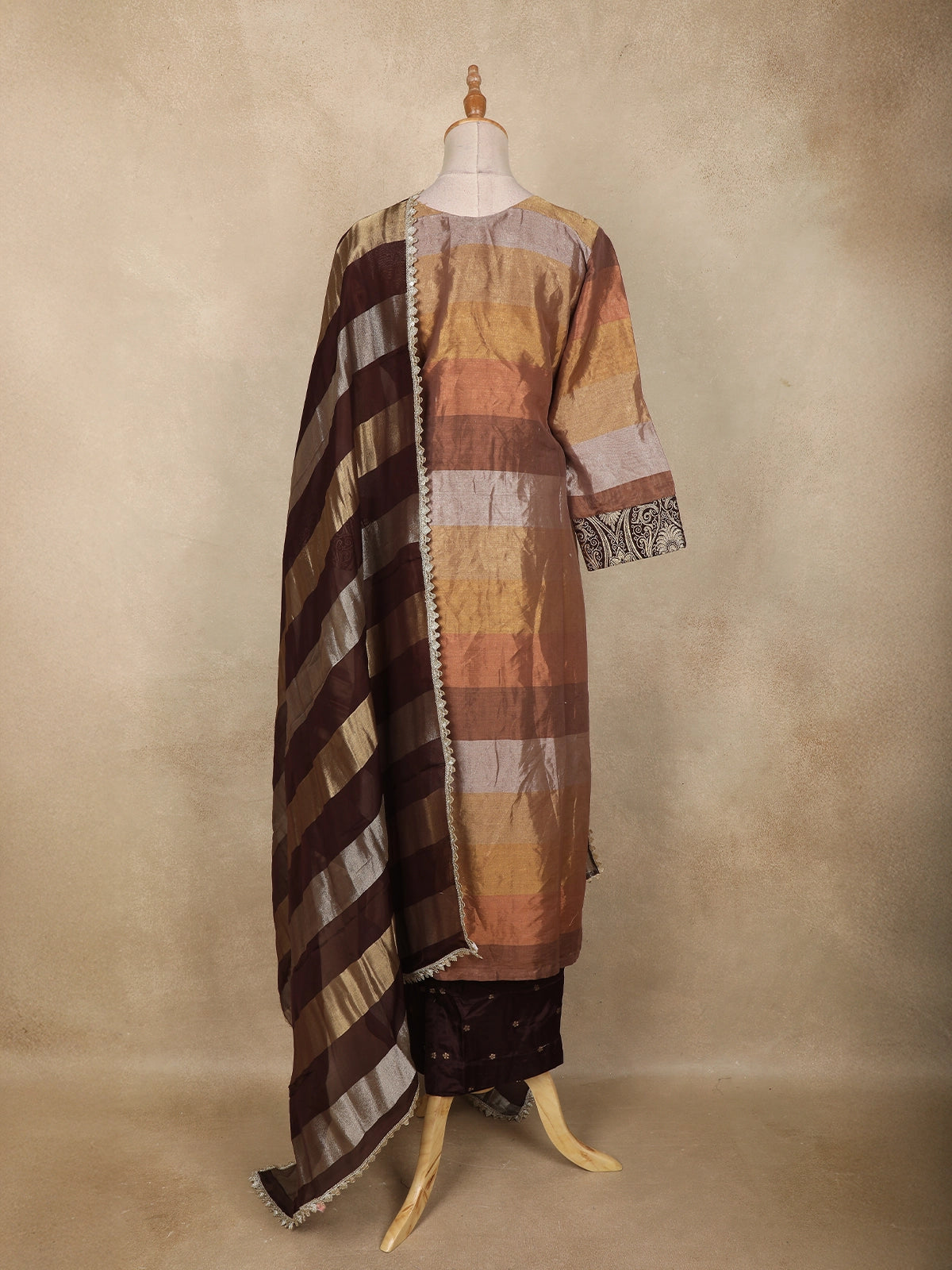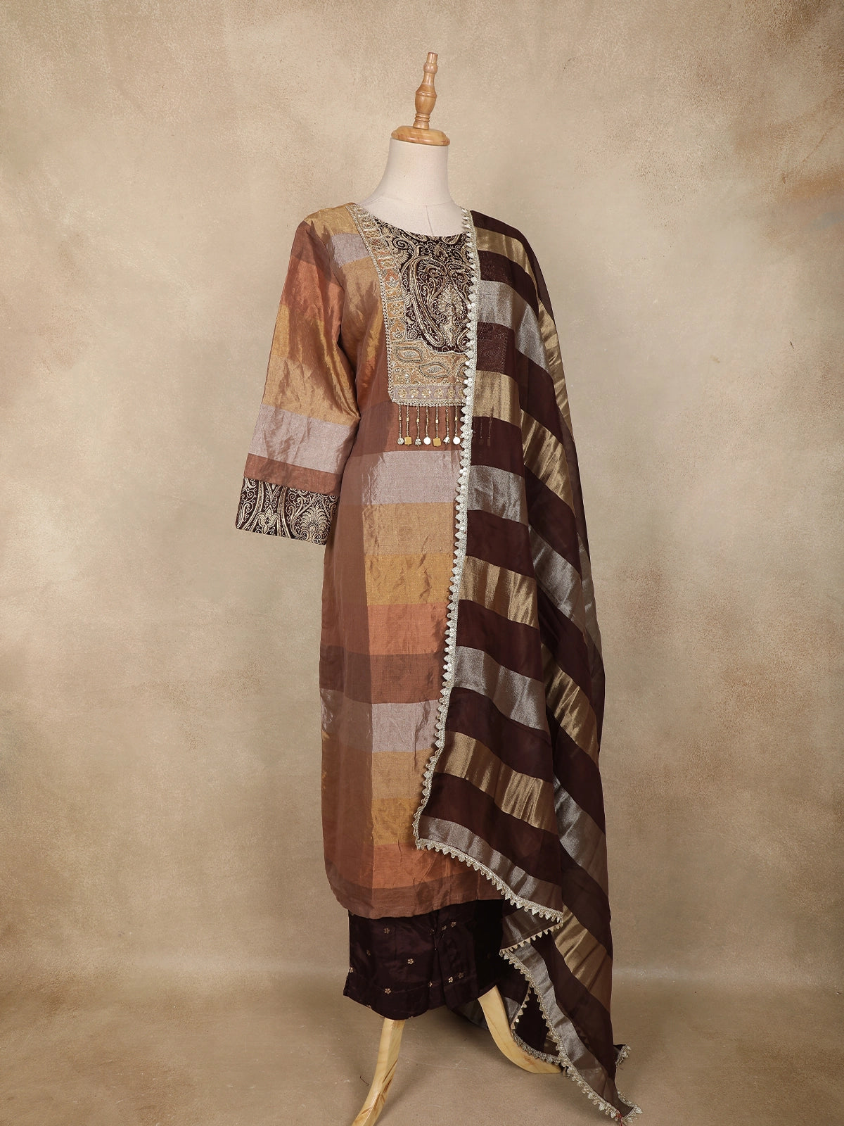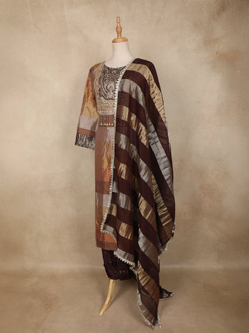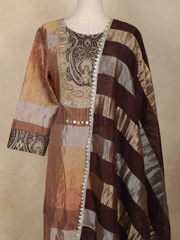 Brown and Gold Floral Embroidered Tissue Silk Salwar Suit with Striped Dupatta