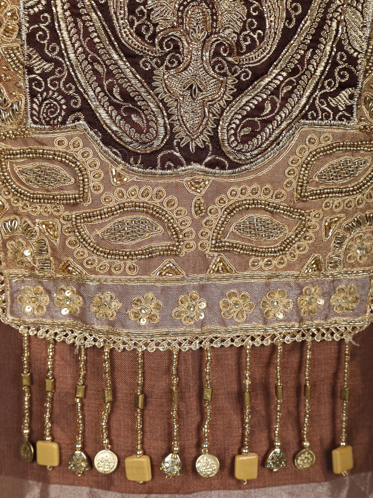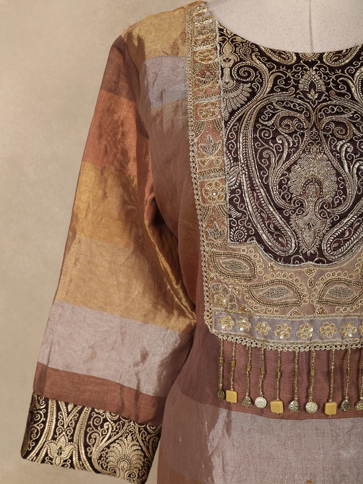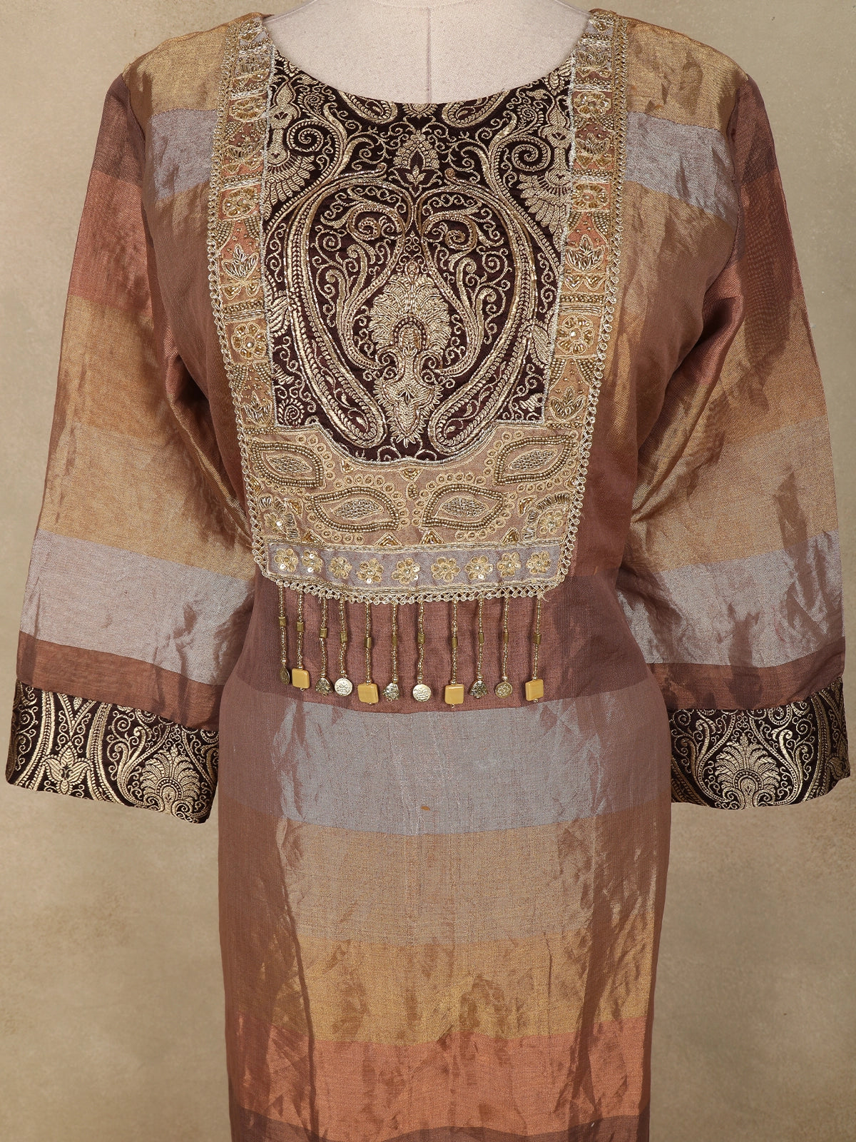 Brown and Gold Floral Embroidered Tissue Silk Salwar Suit with Striped Dupatta